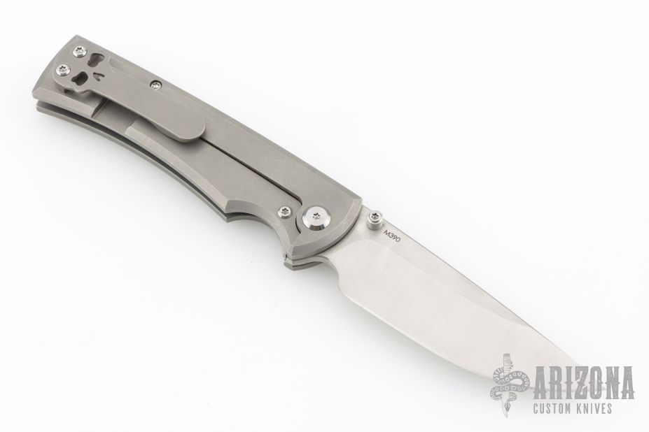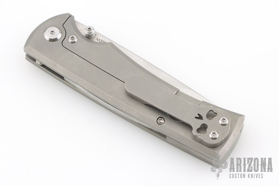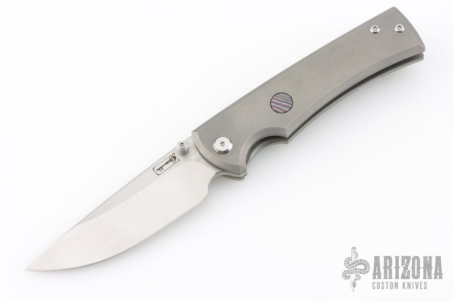 This Chaves Ultramar Liberation drop point has been professionally converted to a side-opening automatic by Kyle Vallotton. It features a satin finished blade with the Chaves logo, a tumbled titanium frame with skull pocket clip positioned for tip-up carry. Additional details include jeweled steel backspring. The knife comes with its original box and a spare titanium pocket clip, and is offered new from the maker.
