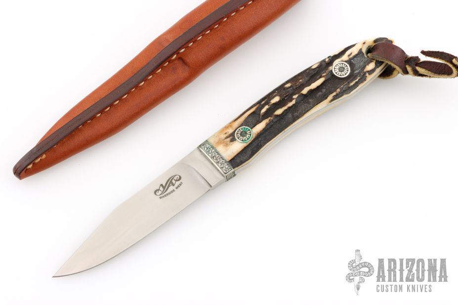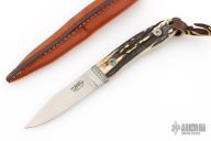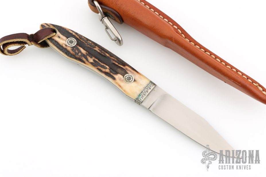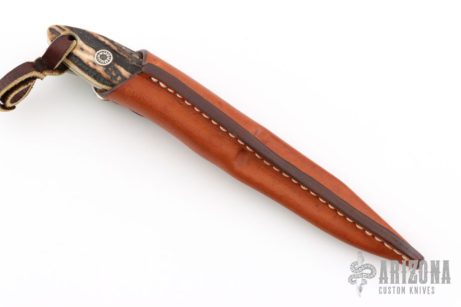 This Loveless Style Lamb Utility by Yoshi Aida features a hand rub satin finished clip point blade, .154" blade stock and .780" blade depth, full tapered tang construction. The handle has engraved nickel silver bolsters with stag scales and engraved nickel silver pins. Lanyard hole in pommel. Includes leather dangler sheath. Excellent condition. Engraved by Simon Lytton