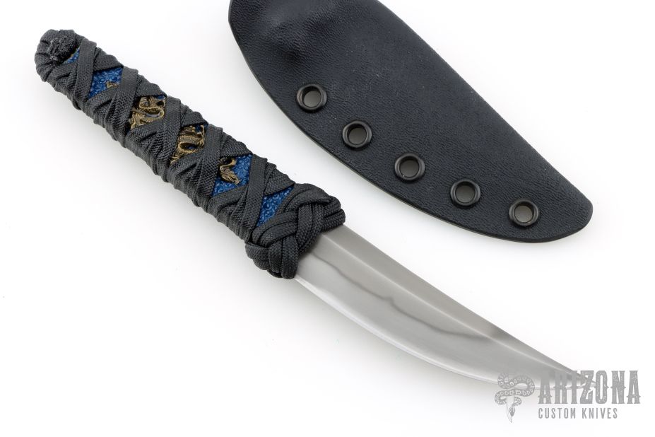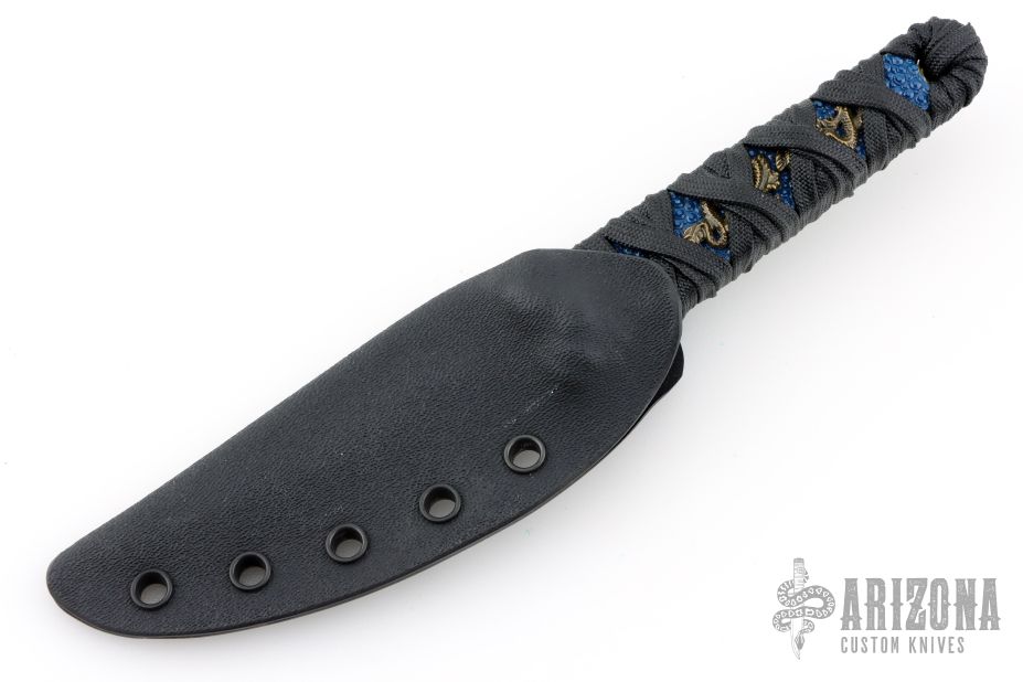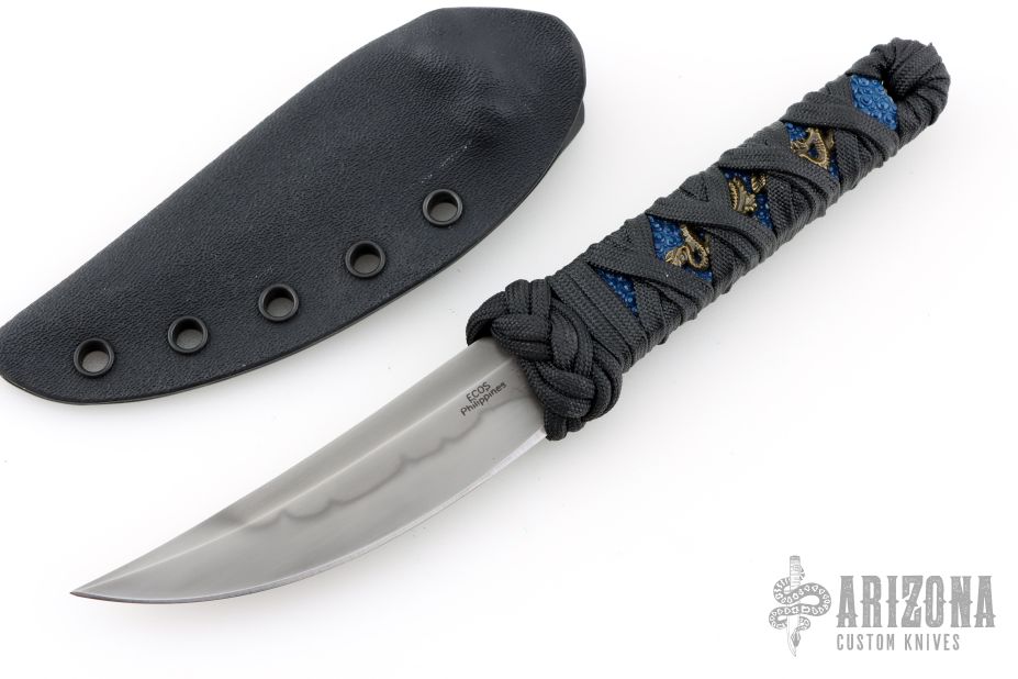 This knife by Ecos Knives features a trailing point blade with nice hamon, .156" Blade stock and .947" Blade Depth, hidden tang construction. The handle is blue stingray skin under black cord wrap with brass dragon menukis and turkshead knot. Includes kydex sheath. Excellent condition.