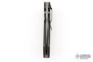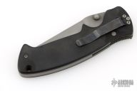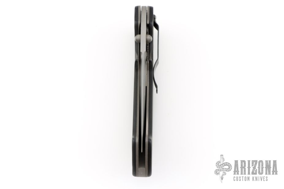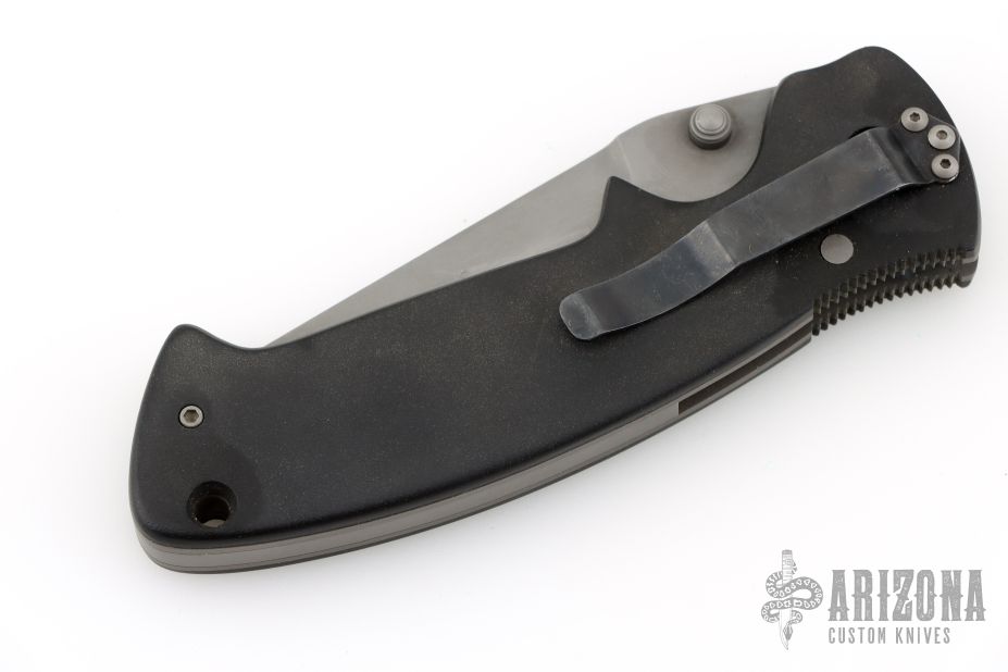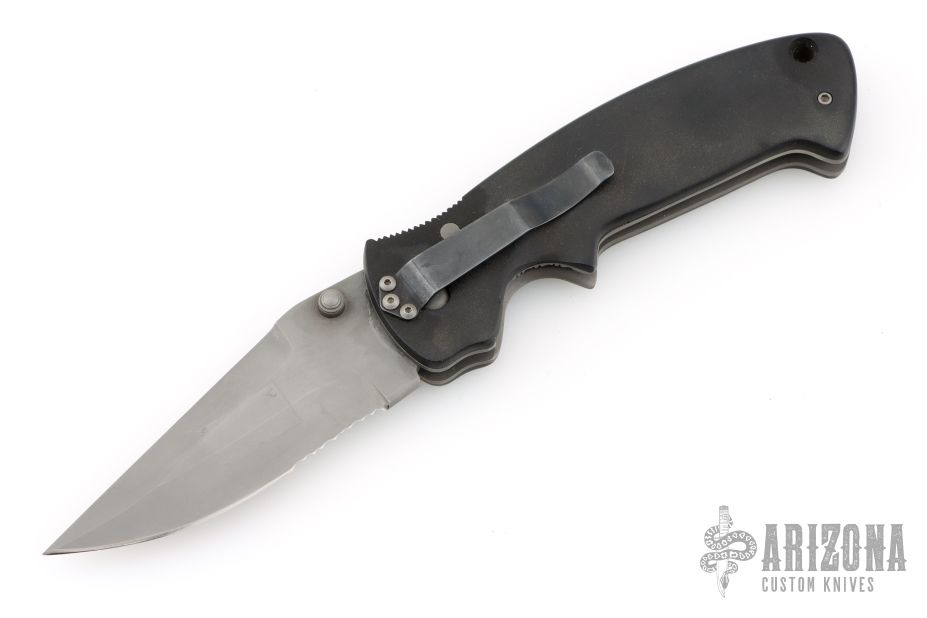 This Pat Crawford Lefty Kasper features a bead blast finished clip point blade with partial serrations, dual thumbstuds. The handle has black scales, bead blasted titanium liners, stainless steel tip down pocket clip (cliped for left handed carry) and a steel backspacer. Has solid lockup. Has some scuffs and scratches, great condition for its age and otherwise.