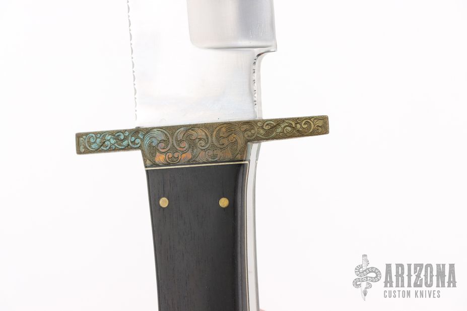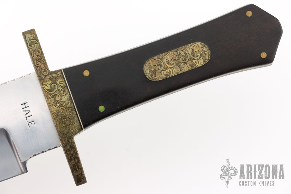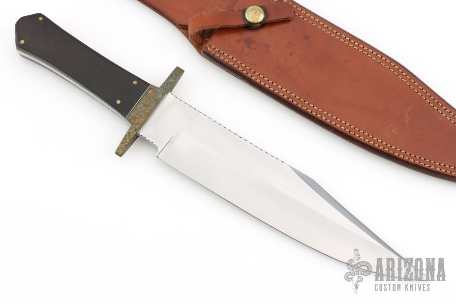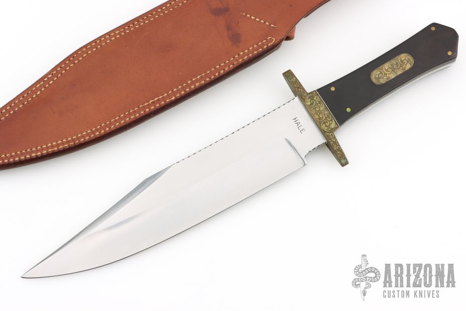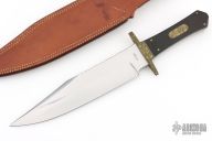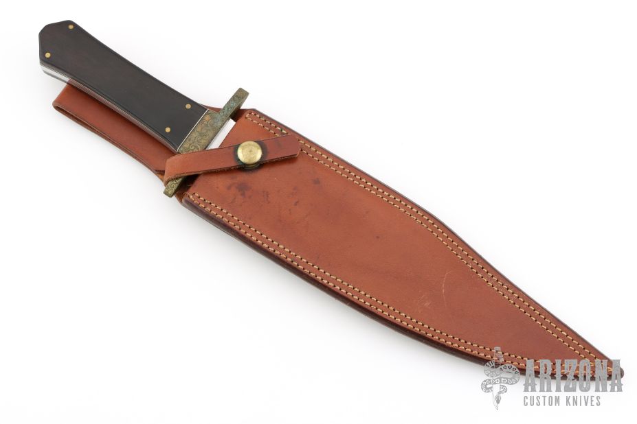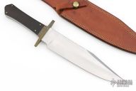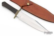 This Bowie by Lloyd Hale features a satin finished blade with a sharpened top edge and fileworked spine, .249" blade stock and 1.925" blade depth, full tang construction. The handle has an engraved brass guard, Macassar Ebony wood grip with an engraved brass escutcheon, black and white liners. Comes with a brown leather sheath by Cooper. Excellent condition.