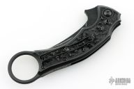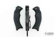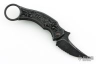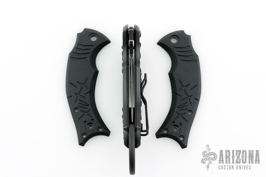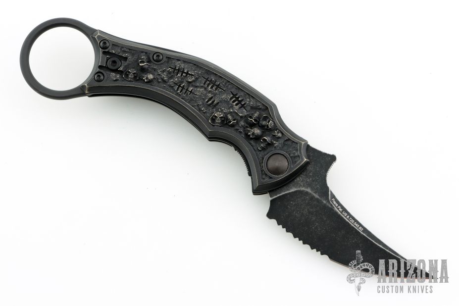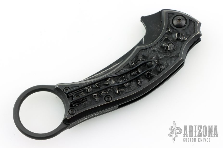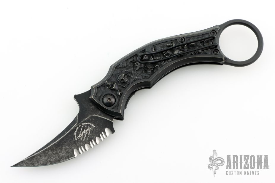 This Mako from Bastinelli Knives features a dark tumble finished upswept blade with a false top edge, partial serrations, and a notched thumbrest. The handle has cast skulls for scales with a one inch finger hole on pommel. Tip up black stainless steel wire pocket clip. Includes a box and original black scales. Excellent condition.