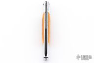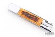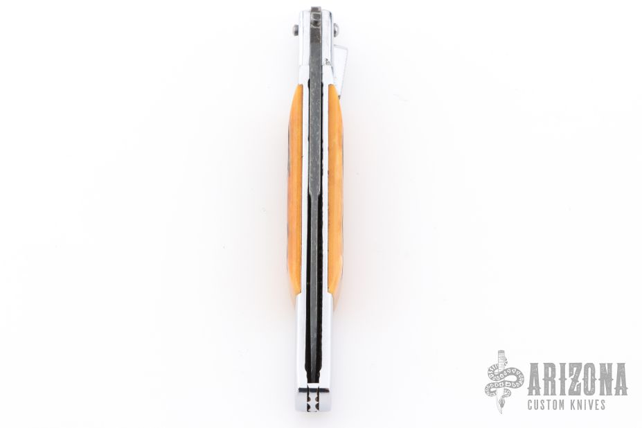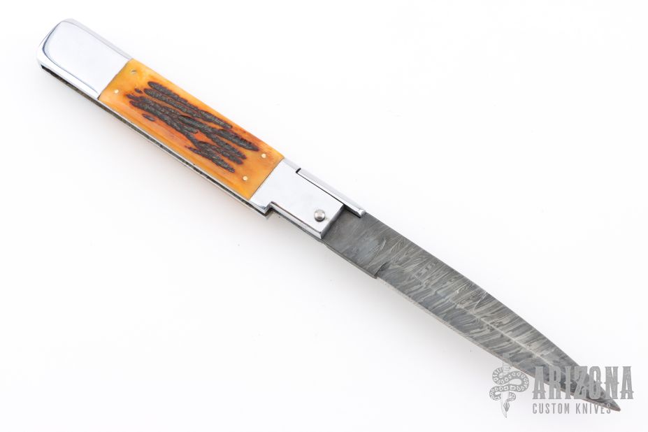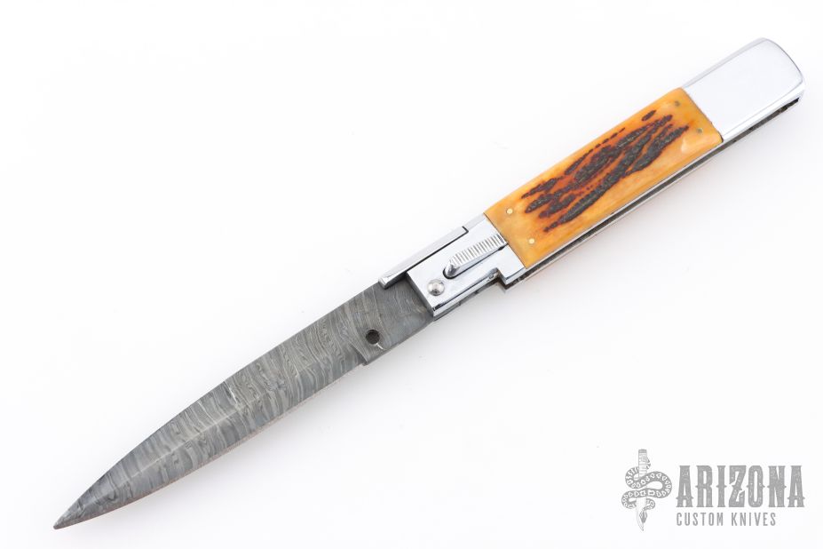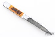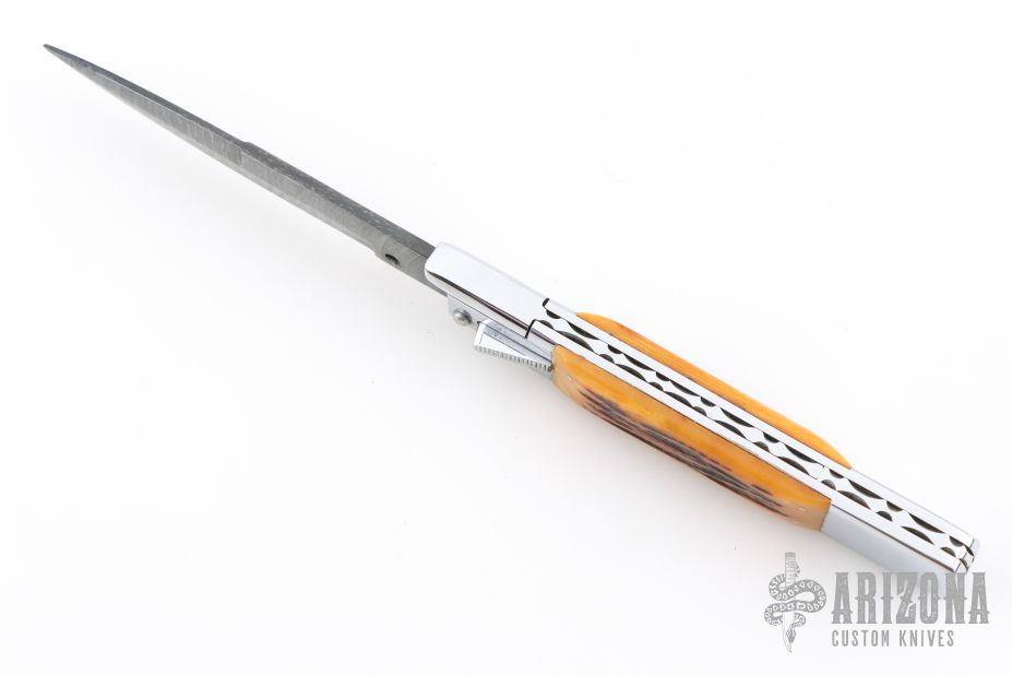 This Picklock Auto by Agasi Hambartsumian of Armenian Doctor Knives features a Damascus bayonet ground blade with a false top edge. The handle has a polished stainless steel frame with fileworked stainless steel backspacer, jigged bone scales with brass pins. New from maker.