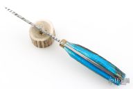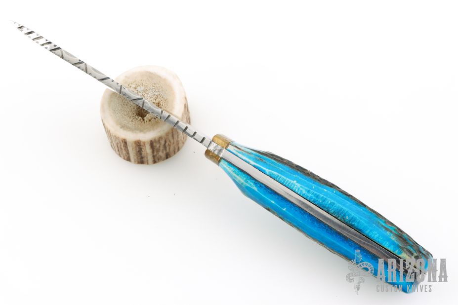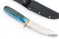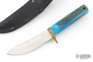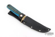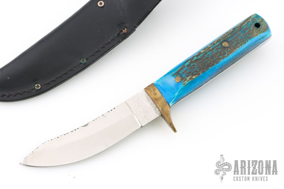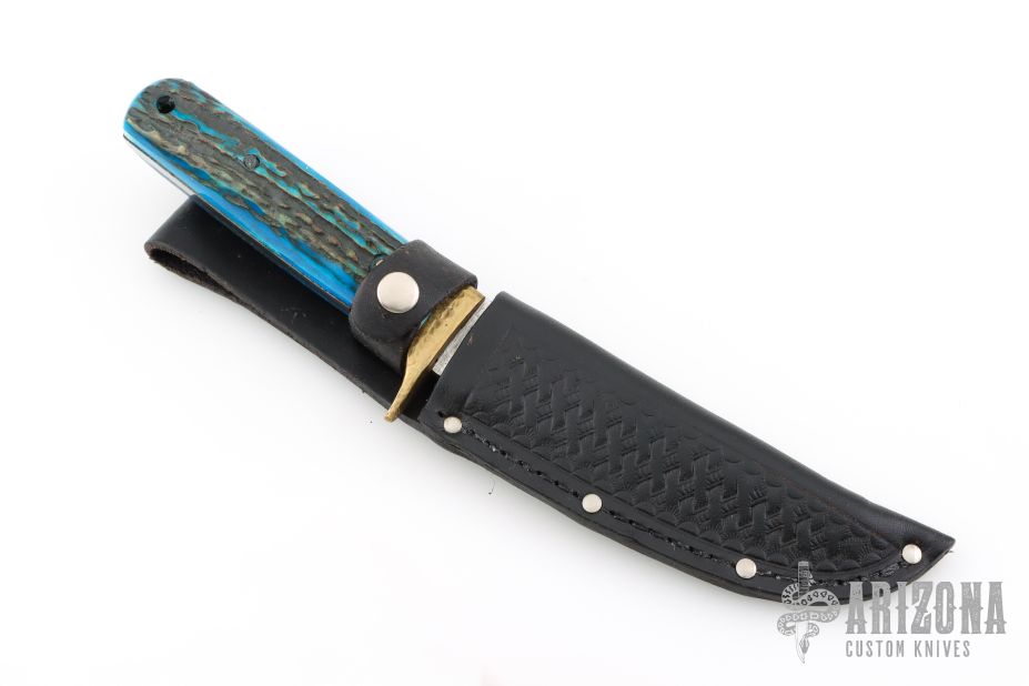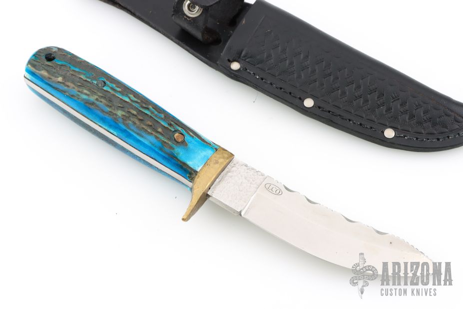 This knife features an unswept blade with a full tang construction.  .182" Blade Stock.  1.115" Blade Depth.  Fileworked blade spine.  Brass guard with dyed stag scales.  Includes a black leather sheath.  Has a few scuffs and scratches.  Scales has shurken otherwise the knife is in good condition.