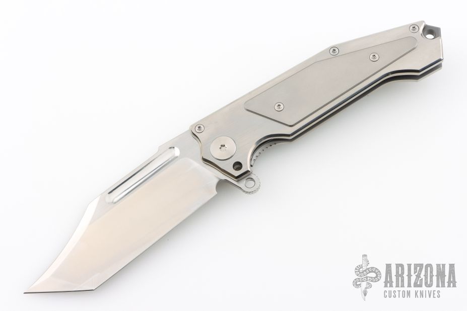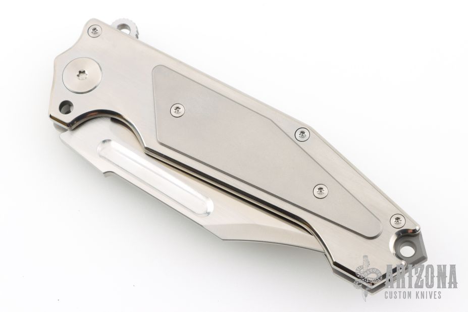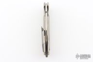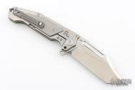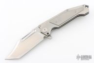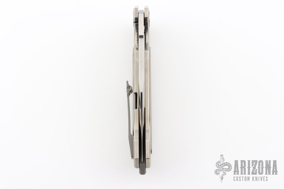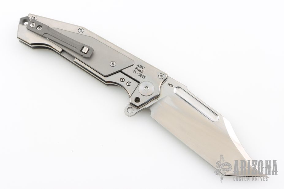 This ADV Freak framelock flipper has high satin finished clip point blade with fuller and flipper tap. The handle has a satin finished titanium frame with bead blast finished titanium inlay, with stainless steel lockface insert and over travel stop. Tip up roller ball clip. Great blade seating, detent and lock up. Blade marked 21-2025. Includes maker's padded and zippered case. New from maker!