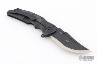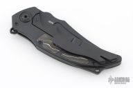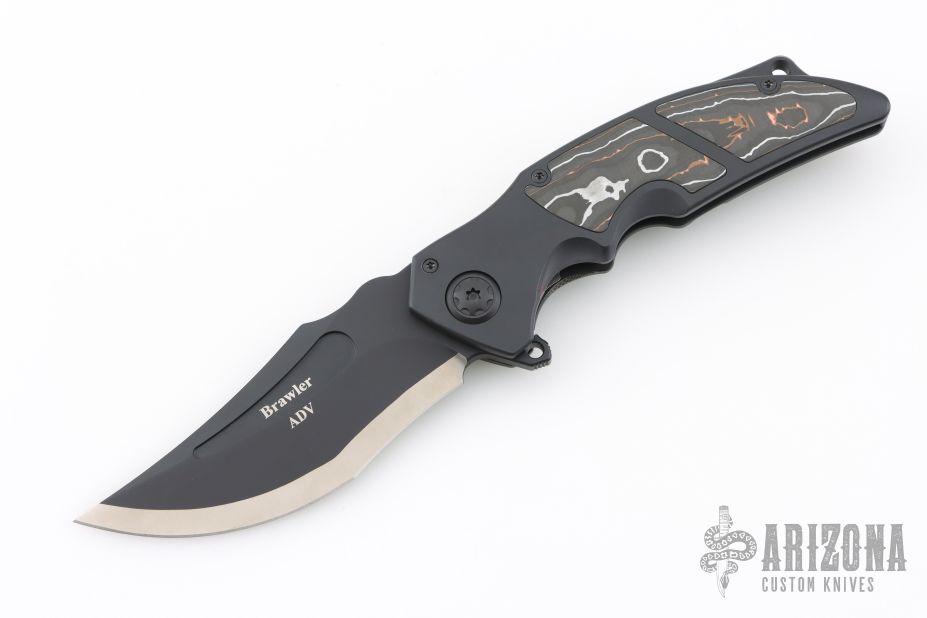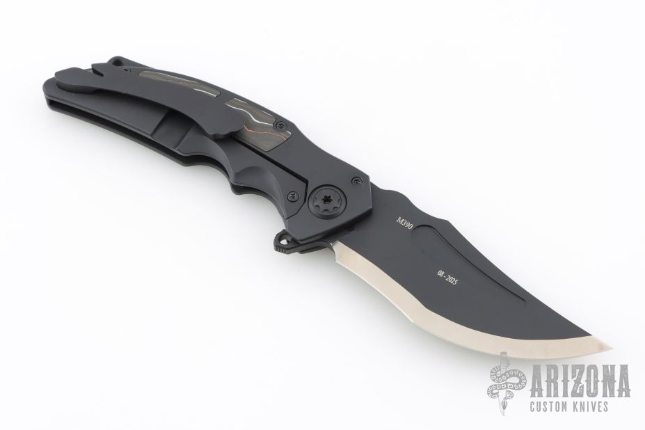 This ADV Brawler framelock flipper has a black finished clip point recurve blade with fuller and flipper tap. The handle has a black finished titanium frame with copper carbon fiber inlay, with stainless steel lockface insert and over travel stop. Tip up clip. Great blade seating, detent and lock up. Blade marked 08-2025. Includes maker's padded and zippered case. New from maker!