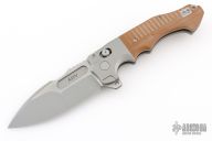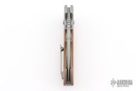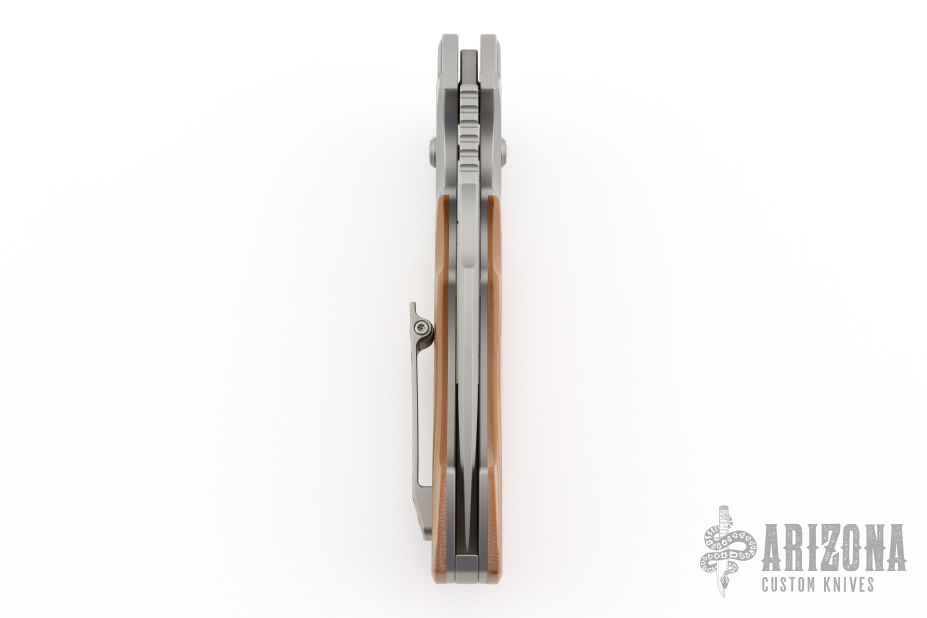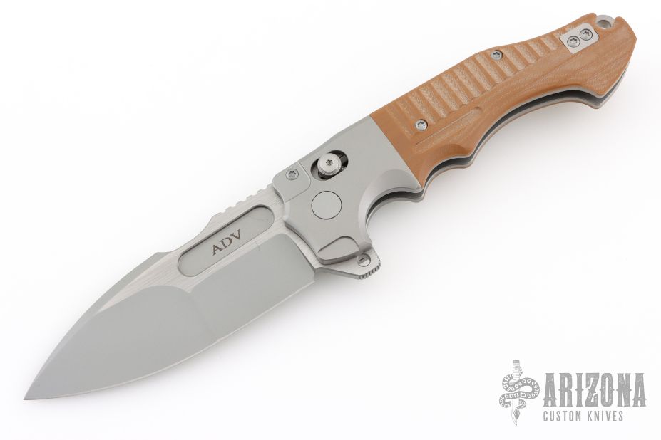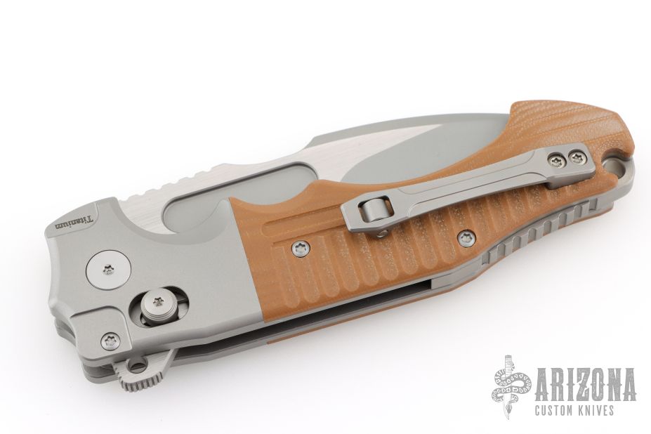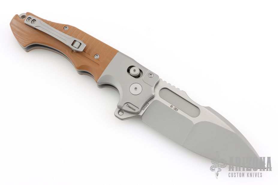 This Bullshark by Andre De Villiers features a bead blast and satin finished multi-ground blade with fuller, notched thumbrest and flipper. It swings smoothly on a ball-bearing system and has both a thumb hole and flipper opener; It has a bead blast finished titanium handle with bead blast hardware, with tan G10 overlays. A jimped titanium backstrap with a lanyard hole and a tip-up, titanium pocket clip. "45-2025" on the ricasso.