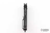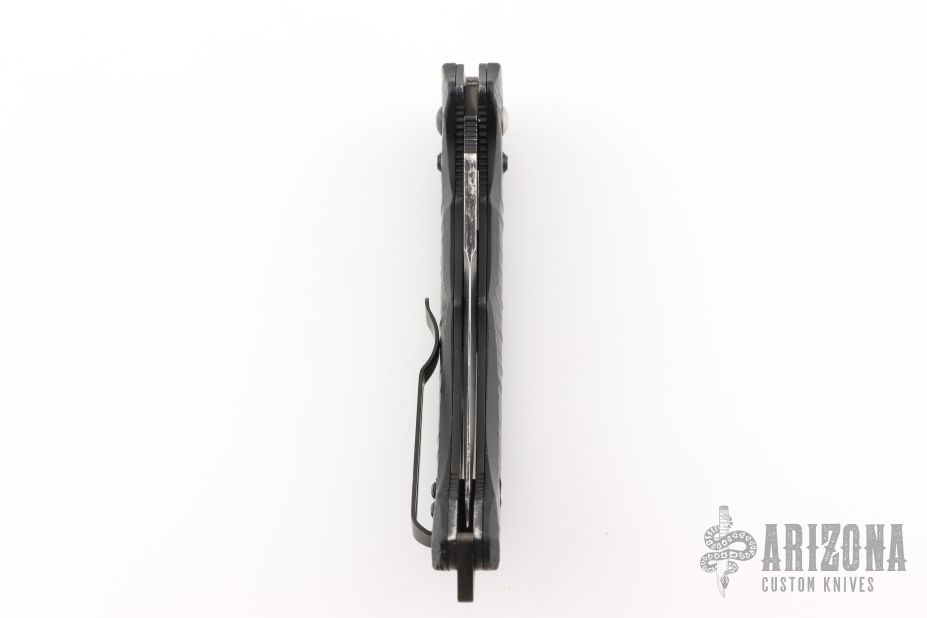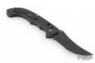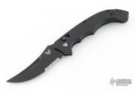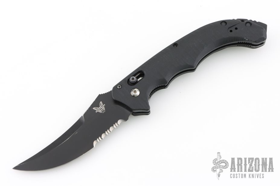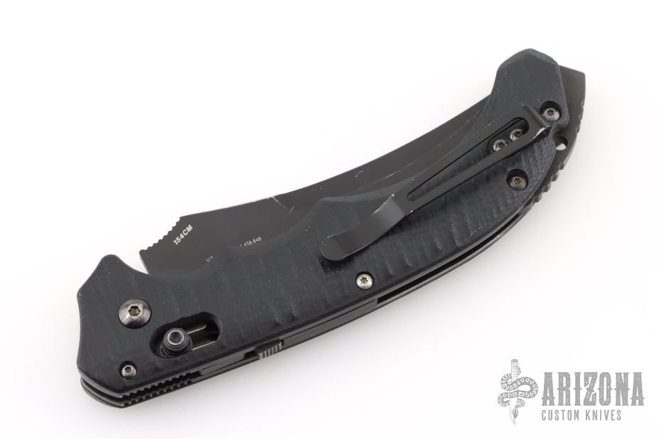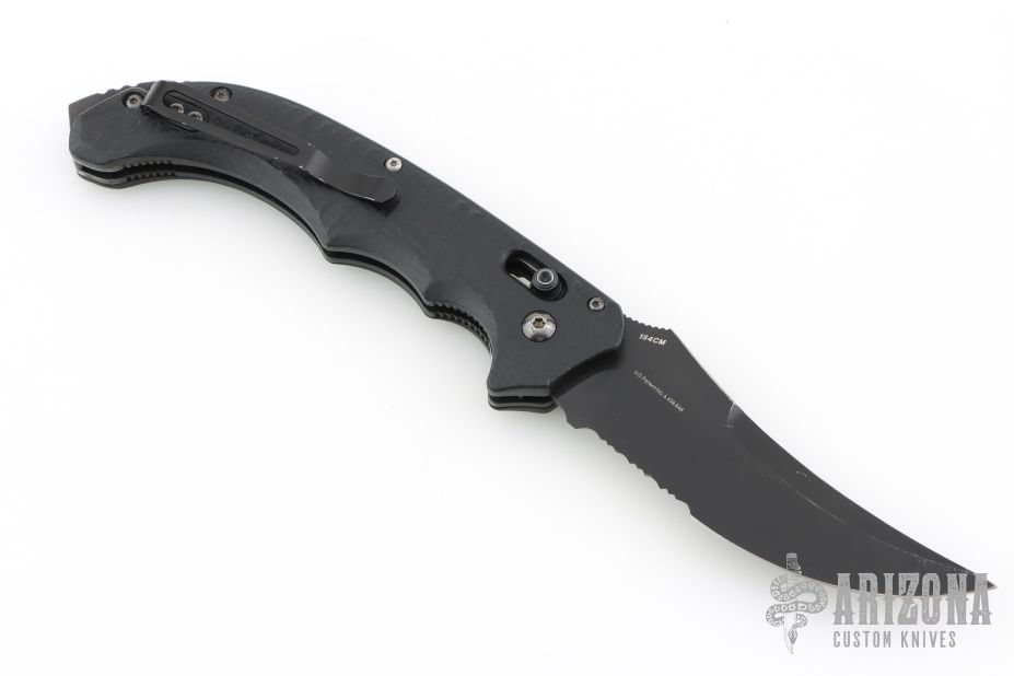 Well-balanced, symmetrical, eye-catching, The Bedlam has a black coated 154CM partially serrated blade that is released with the AXIS locking button.  Safety on top of knife. Sculpted black G10 handle fits comfortably and securely. Reversible tip up black clip. Has some light scuffs and scratches, otherwise good condition.