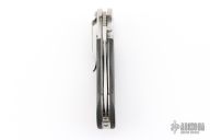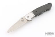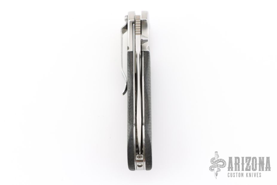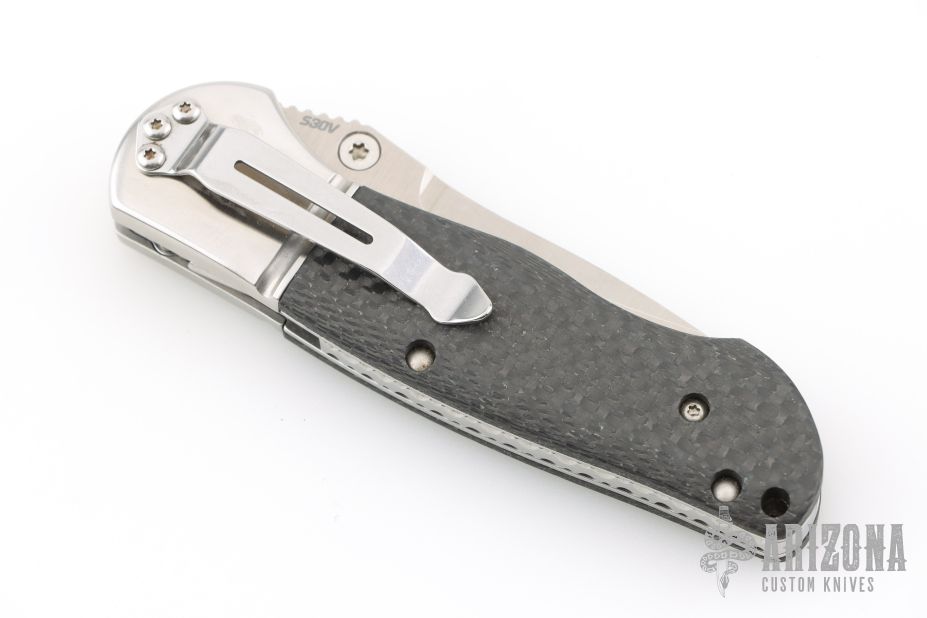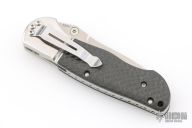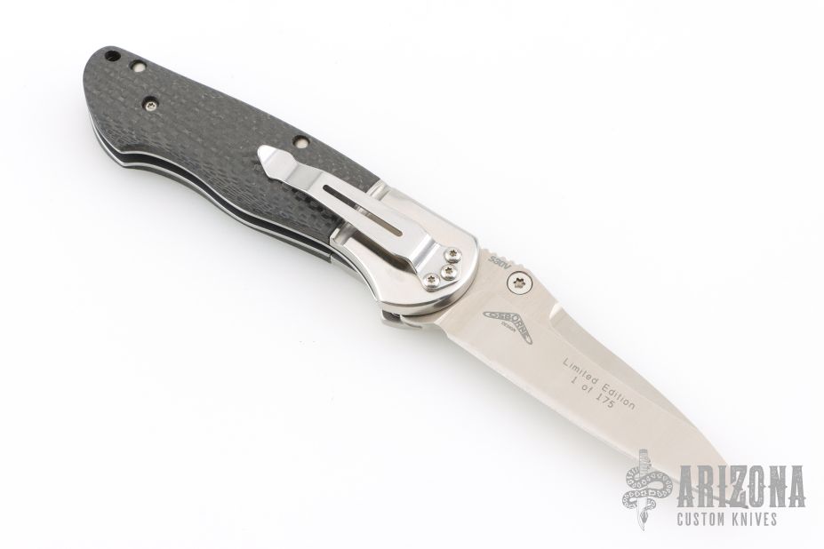 This Apparition by Benchmade features a tumbled drop point blade with swedge, dual thumb studs and notched thumbrest. The handle has stainless steel bolsters and carbon fiber handle scales over steel liners and file worked steel backspacer. The steel pocket clip is positioned for right hand, tip down carry. Has a couple very light scratches, otherwise excellent condition. Limited Edition 1 of 175