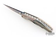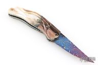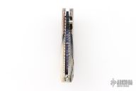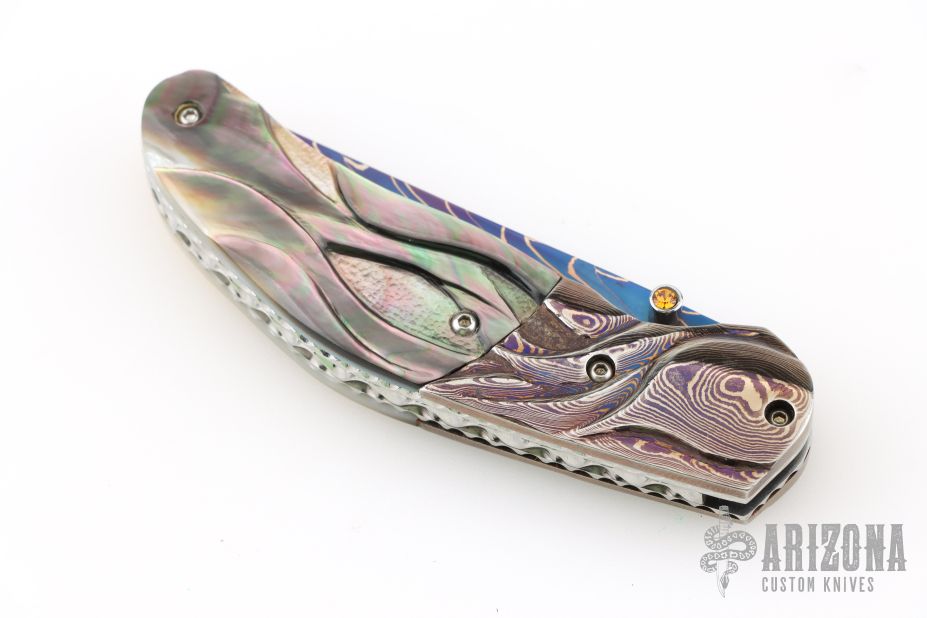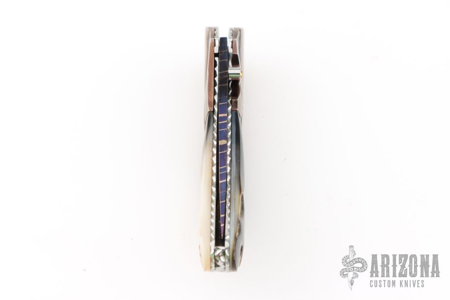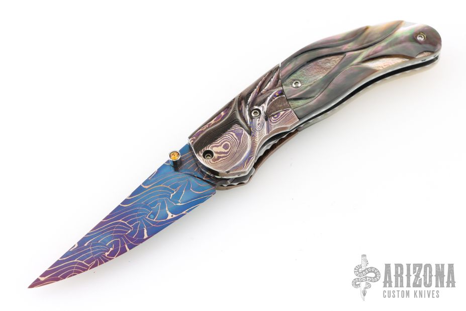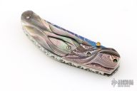 This linerlock by Appaloosa Knives features a blued Damascus blade with a single  thumbstud with stone inlay. The handle has polished and carved Damascus bolsters, carved black lip pearl inlays, fileworked and anodized liners and backspacer. Nice detent, blade seating and lockup. Excllent Condition.