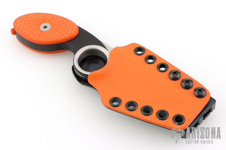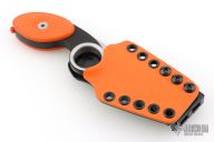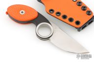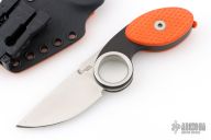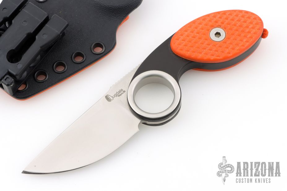 This fixed blade from Dan Dugdale features a satin finished blade with notched thumbrest, .126" blade stock and 1.202" blade depth, hidden tang construction. The handle has a flanges titanium ring, black frame, and checkered orange G10 covers. Comes in a Kydex sheath. Excellent condition.