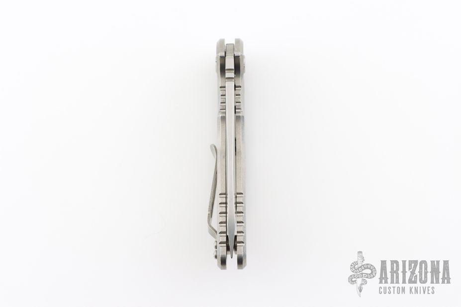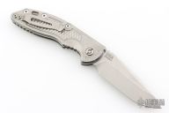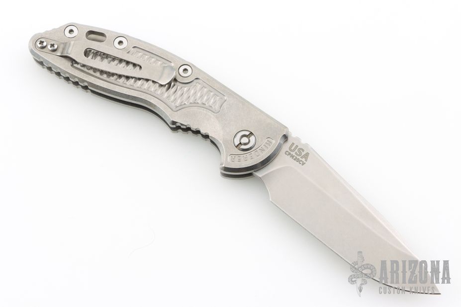 This XM-18 Flipper by Rick Hinderer Knives features a 3.5" stonewashed finish blade, notched thumbrest and flipper.  The handle has a stonewashed titanium frame with a matching tip up pocket clip.  Includes original box and papers. Excellent condition.