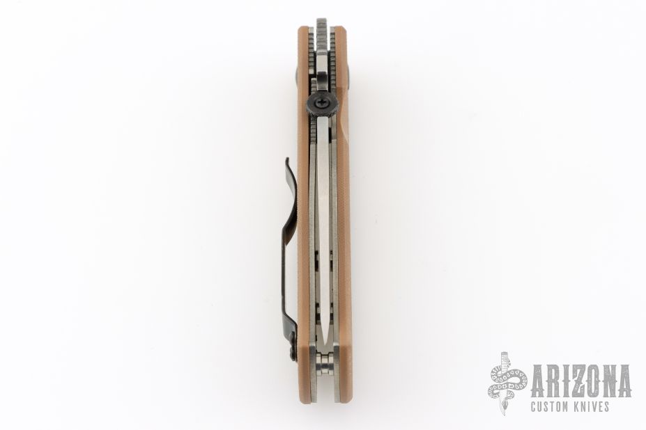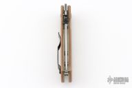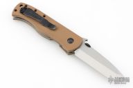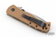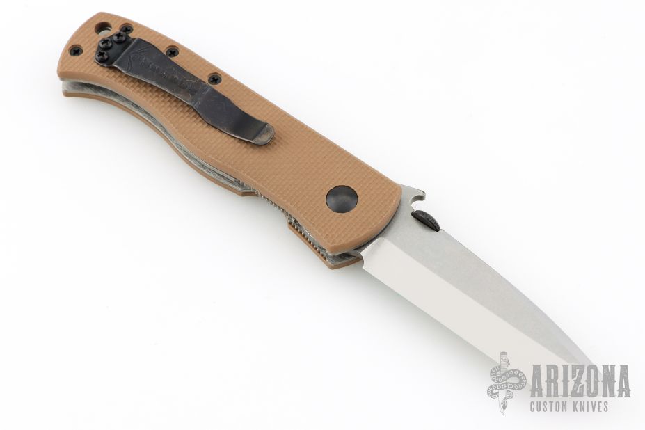 This production CQC-7V-BT by Emerson Knives has a stonewashed v-ground tanto blade with notched thumbrest and thumb disc. The handle has tan G-10 scales, titanium liners, tip up black stainless clip, lanyard hole. Numbered 3277. Excellent condition. Comes with an Emerson box and papers.