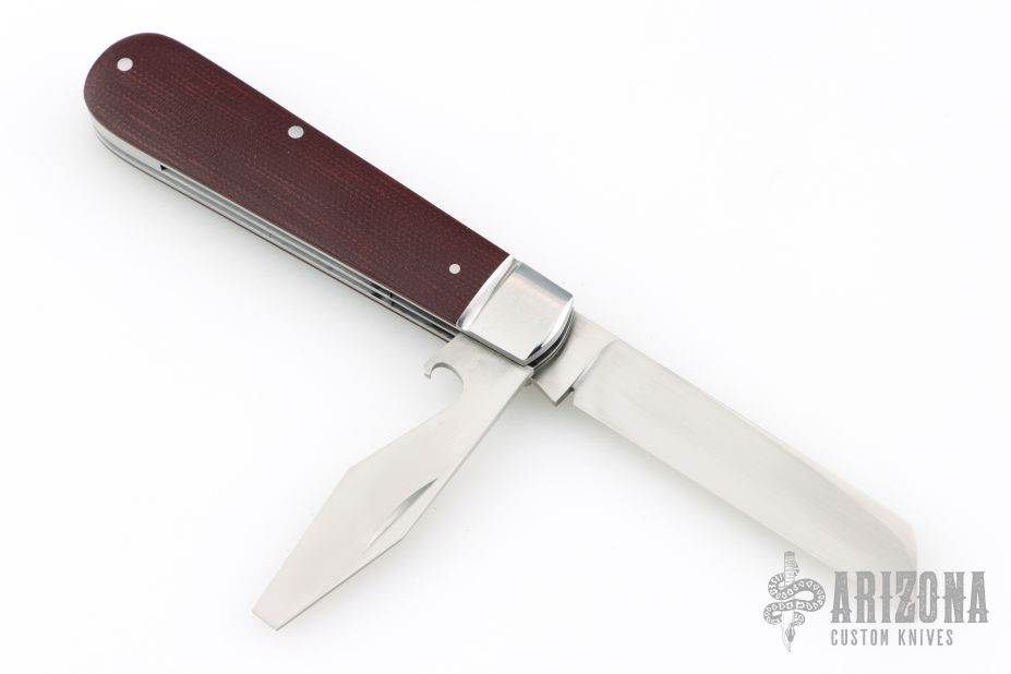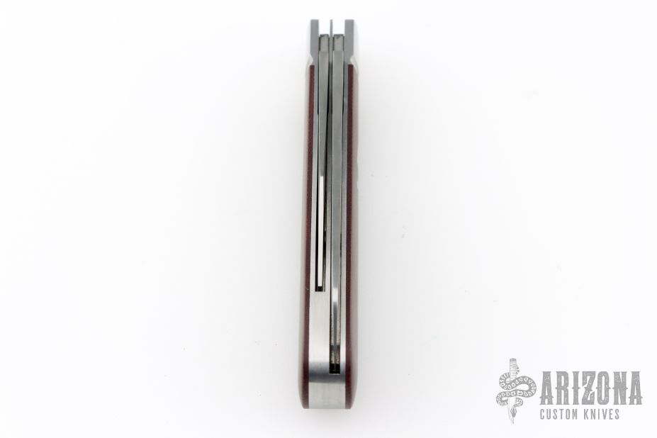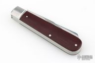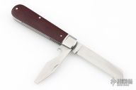 This slipjoint from Mike Moran features a hand rub satin finished wharncliffe blade with nail nick and a hand rub satin finished cap lifter blade with a nail nick. The handle has fluted stainless steel bolsters, double red canvas micarta covers with a stainless steel escutcheon, stainless steel liners, stainless steel springs. Spring is flush in the closed, half stop, and open positions. Nice blade seating and function. Excellent condition. Comes with zippered case and COA dated 4/9/2023 and #150