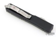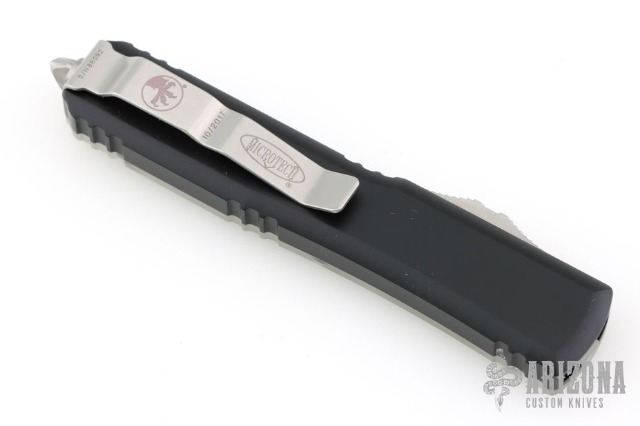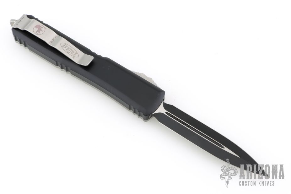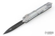 This Ultratech by Microtech features a black standard double-edged blade with fullers. The handle has a black aluminum frame with contoured clear top, and bead blast stainless steel hardware and tip down clip. Dated 10/2017 and s/n 86092. Excellent condition. Comes with original box.