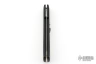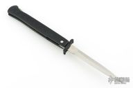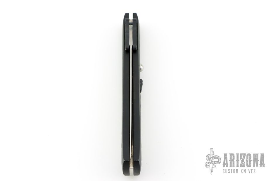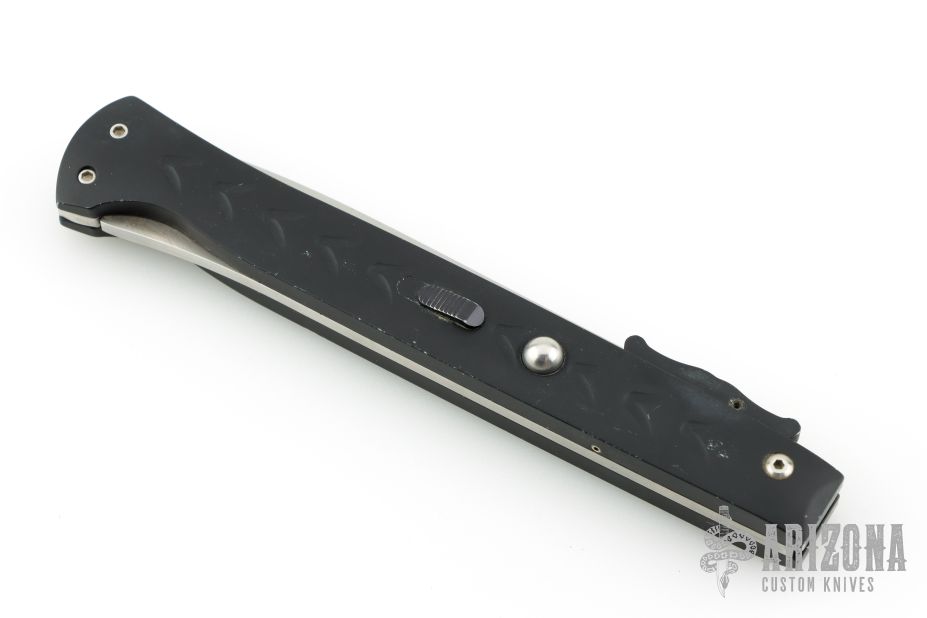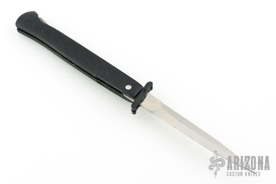 This Phantom Italian swing guard automatic by Dynamic Knife Designs has a satin finish blade and black aluminum handle. Features a ramped side positioned stainless steel safety just below the firing button. False top edge. Button release/single action with closure via the rear positioned lockbar release. Dual leaf and coil spring action providing an extremely fast opening. When closed, the dual guard rests on the frame, encompassing the blade tang. Upon opening, the guard swings into a locked position. Has scuffs and scratches throughout, good condition otherwise.