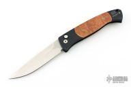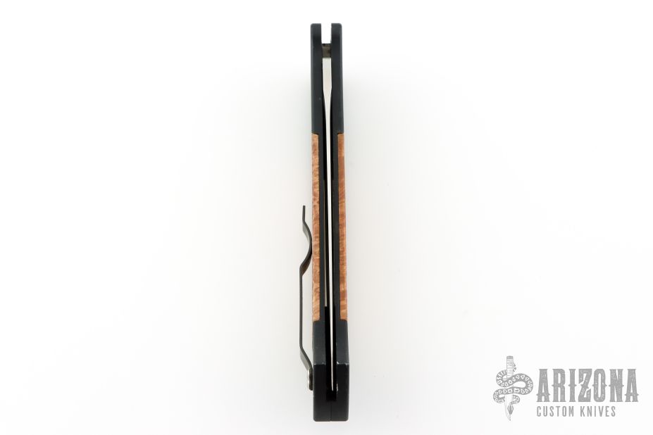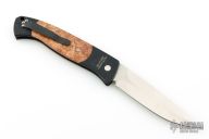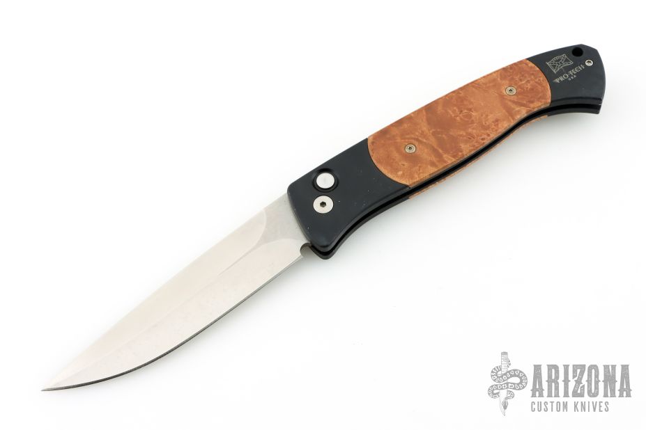 This Brend #1 by Pro-Tech Knives has a satin finished blade, DLC black coated handle with maple burl inlays. Black stainless steel clip, tip up carry. Marked "First Production 2006 s/n 280" on the back of the frame. The handle has scuffs and scratches throughout, the blade has a couple light scuffs. Good condition; great user condition otherwise.