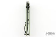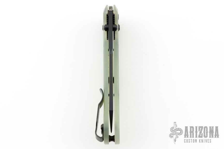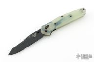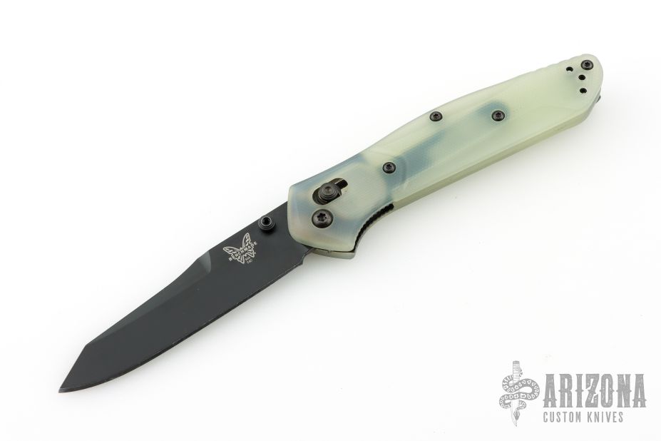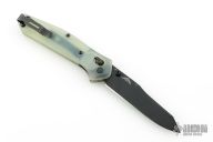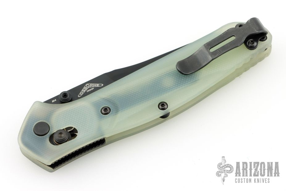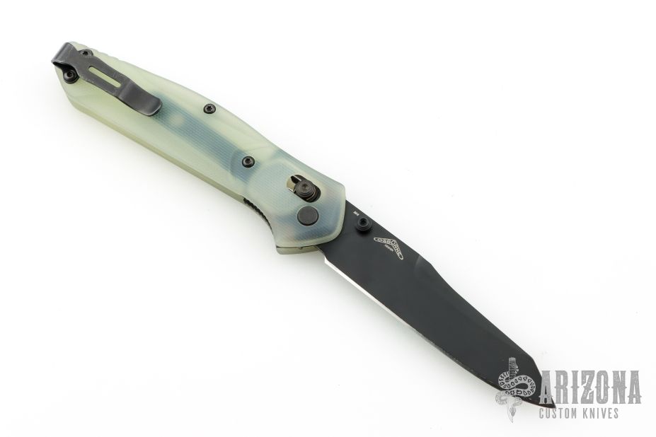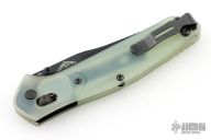 This 940BK Osborne Axis Lock Folder from Benchmade has a black coated clip point blade with false top edge and dual thumbstuds. Handle is jade G10 with a black finished stainless steel tip up clip (RH/LH Reversible). Nice blade seating and lockup. Comes with original box, papers, and drawstring pouch. Has some scratches on the clip, excellent condition otherwise.