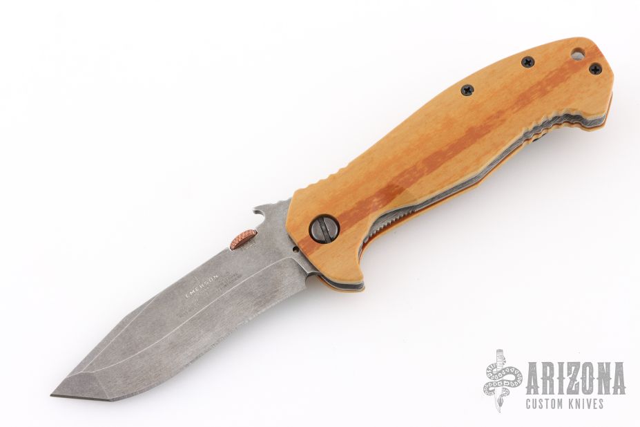 The demand for Ernest Emerson Custom Knives is so high that Mr. Emerson can never fill the supply with his hand made custom creations. This has created a market opportunity for other craftsmen to take Emerson factory knives and turn them into beautiful customized, modified versions of Emerson Knives. However, these are not handmade Ernest Emerson custom knives and as a result they are available at a more affordable price. Any custom or after-market modifications voids any and all stated or implied warranty by Emerson Knives. Any defects or warranty issues must be addressed by the individuals that modified the original Emerson factory knife. These Po Boy conversions and all modified versions of these knives are after-market conversions of Emerson Knives, Inc. factory production knives and that none of these modifications were performed by Ernest Emerson or Emerson Knives, Inc. Any modification to any Emerson Knife voids the Warranty!