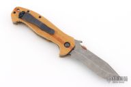 This Emerson PoBoy Mini CQC-15 by Andrew Charlet has a Thunderstorm finished tanto recurve blade with a custom copper Pete Grey thumb disc, wave feature and notched thumbrest. Handle has vintage cheddar paper micarta scales, titanium liners, barrel spacers, lanyard hole and tip up black stainless steel clip. Comes with original black G-10 scales.  #0220. Excellent condition.