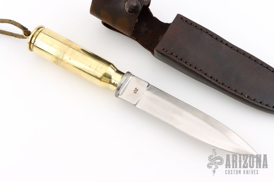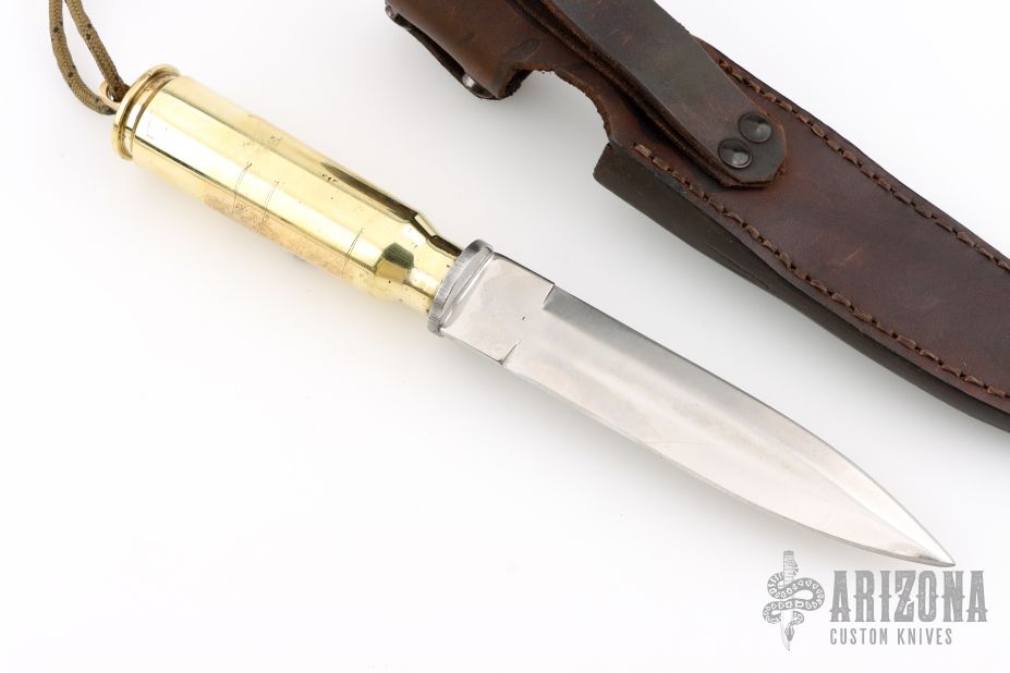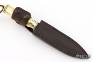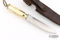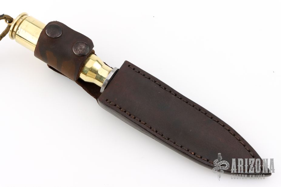 This knife by Jim Ort and features a satin finished double-edged blade, .179" blade stock and 1.125" blade depth, hidden tang construction. The handle has a stainless steel guard and brass casing grip. Lanyard hole in pommel. Comes with custom leather belt sheath. New from maker!