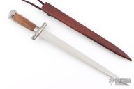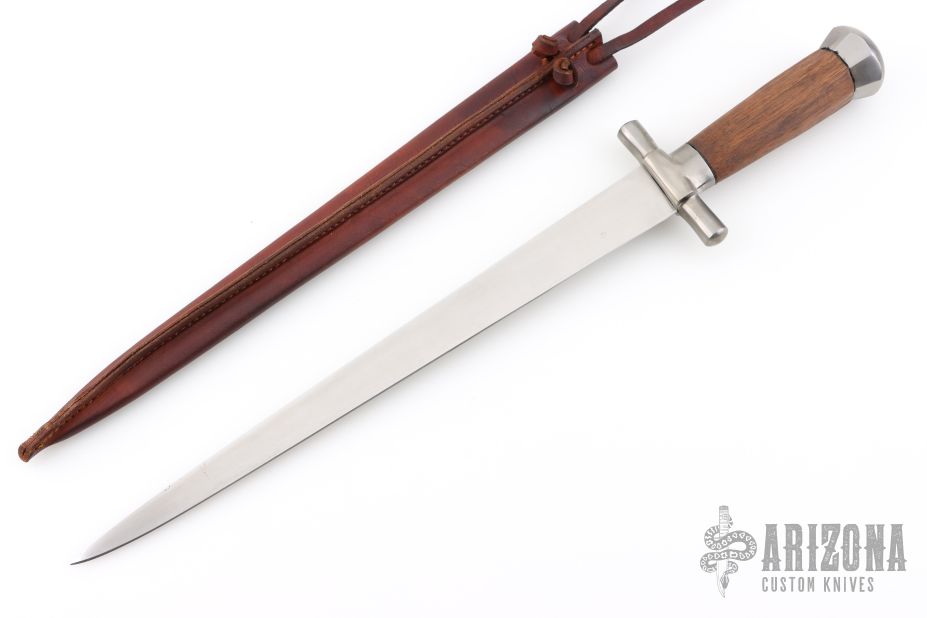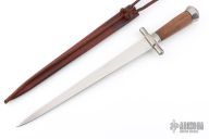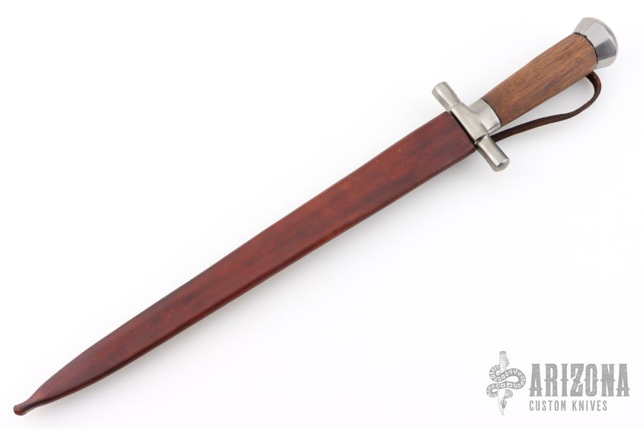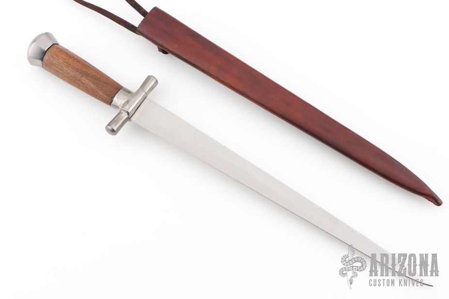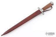 The Köln Messer by Arms & Armor is an excellent example of a German fighting knife from the 14th century. A replica of an original piece in the Kölnisches Stadtmuseum, the piece is 17.5" in overall length with a single-edged blade nearly 12.5" long that tapers to a very fine point optimized for thrusting between plates of armor. The stout crossguard and steel pommel make it very effective when held in an overhand grip, while the 1/4" blade spine gives it plenty of heft for cuts to arms or face. Small messers ranged from utility or eating knives to dedicated fighting knives like this one. Comes with a brown leather sheath. Has some small oxidation spots on the blade, otherwise excellent condition. 6150 Steel