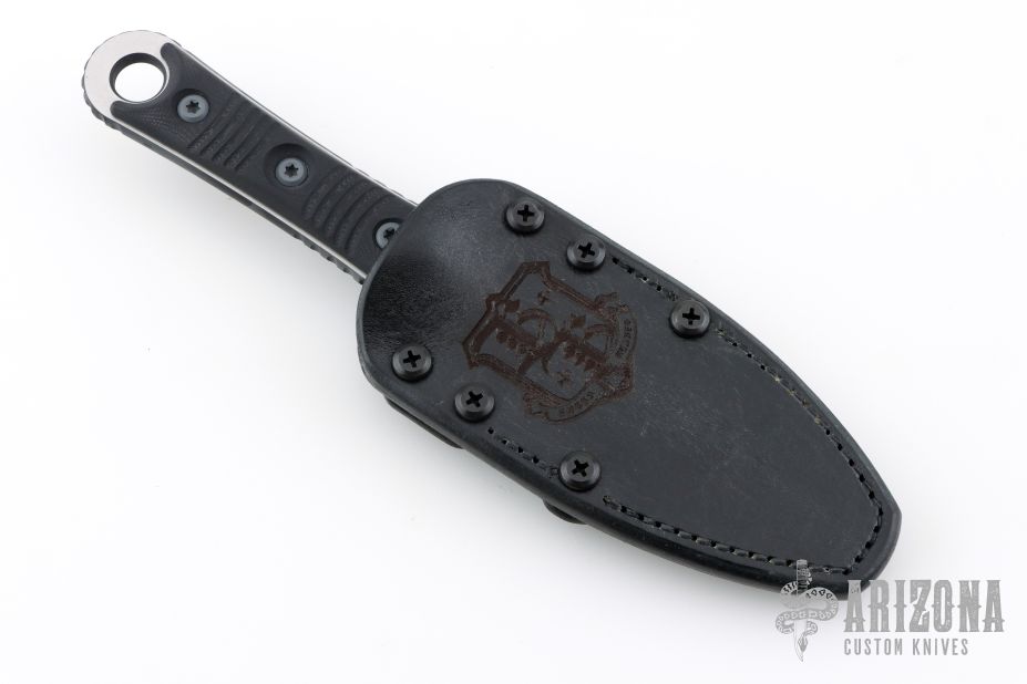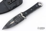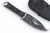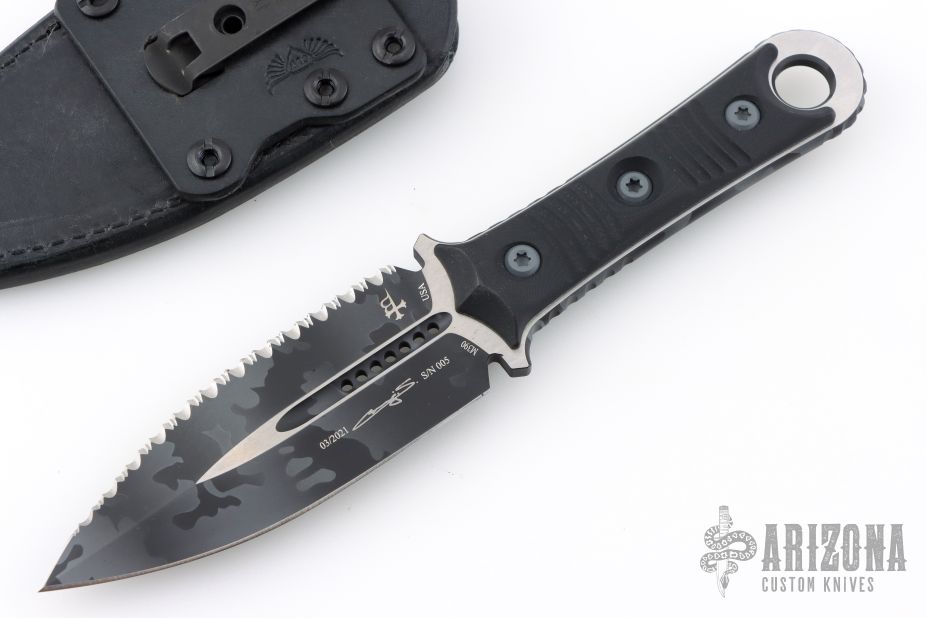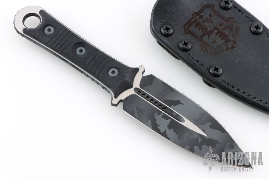 This SBD by Microtech Knives and Borka Blades features an Urban Stripe Camo finished double-edged blade with one fully serrated edge, .192" blade stock and 1.584" blade depth, full tang construction with black G-10 scales. Comes with the original box and papers, dated 03/2021 s/n 005. Excellent condition. Comes with a black leather sheath by Chattanooga Leatherworks.