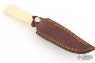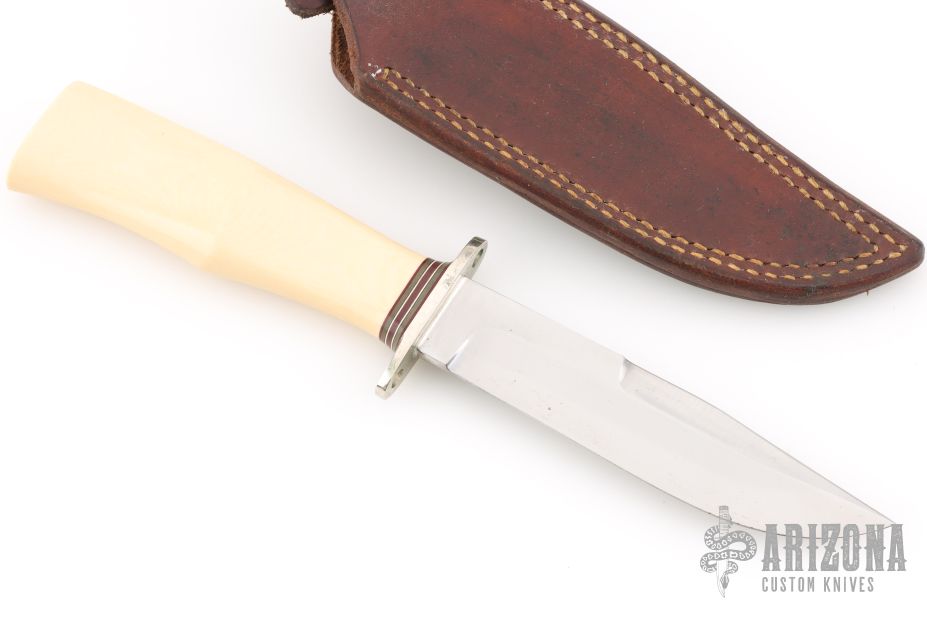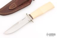 This Chute Knife by Morseth Knives features a satin finished laminated steel blade with false top edge, .190" blade stock and 1.012" blade depth, hidden tang construction. The handle has a nickel silver guard, ivory paper micarta grip with black/white/red spacers. Comes with a brown leather sheath. Has some light scratches, otherwise excellent condition. Comes with original shipping box and papers.