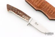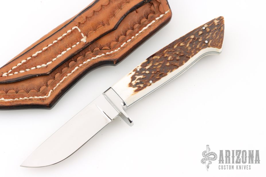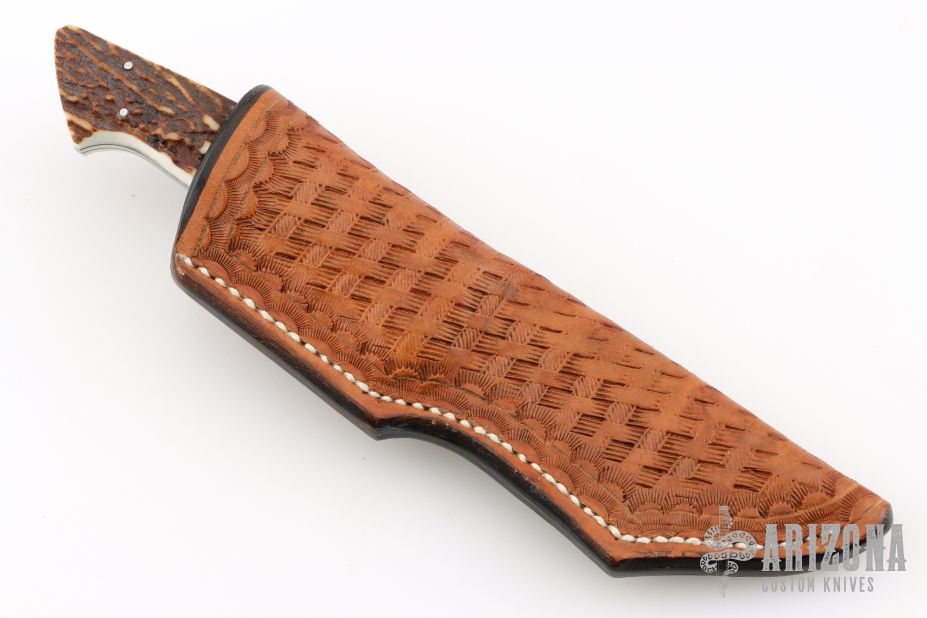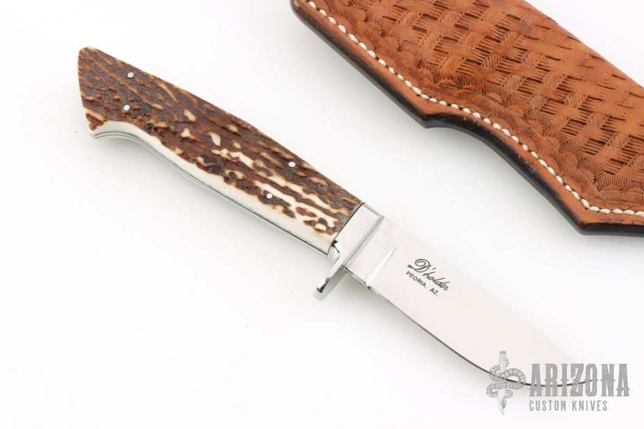 This knife by D'Alton Holder features a mirror polished blade with .141" blade stock and .841" blade depth, tapered tang construction. The handle has a nickel silver guard and pinned stag scales. Comes with a hand tooled brown leather sheath. Has a couple light scratches, otherwise Excellent condition.