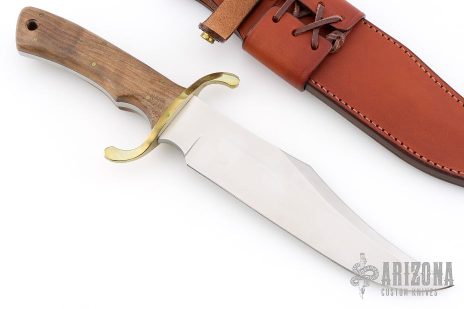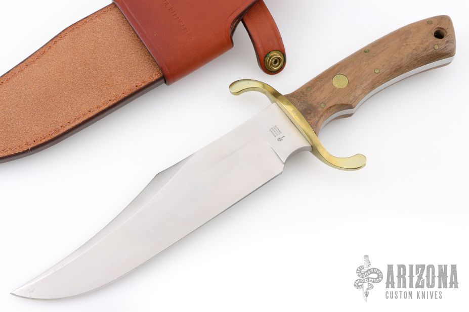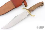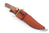 This bowie by Boker features a satin finished blade with false top edge, .252" blade stock and 1.771" blade depth, full tang construction. The handle has a brass guard, walnut scales with brass pins and lanyard hole. Comes with original box, papers and brown leather sheath. Excellent condition. #697