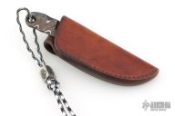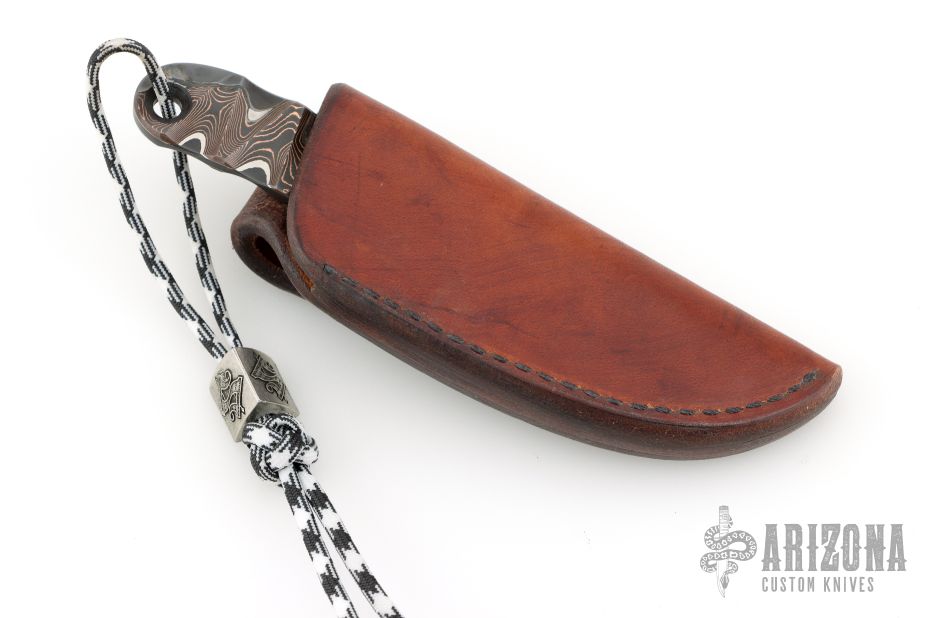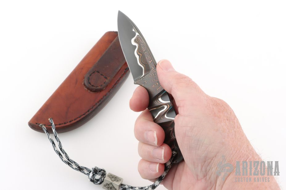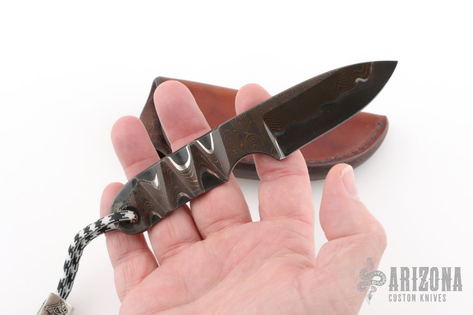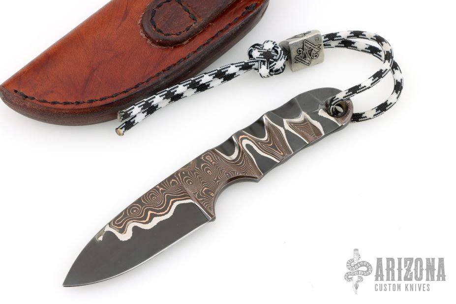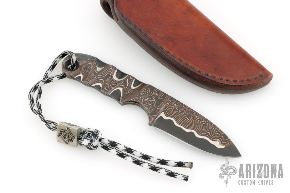 This knife by Mike Snody features a textured and polished copper Damascus blade with .235" blade stock and 1.092" blade depth, full tang construction. Comes with a lanyard, and bead with a leather pocket sheath. Also includes Snody business card. Has a couple light scratches, excellent condition otherwise.