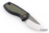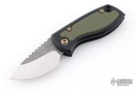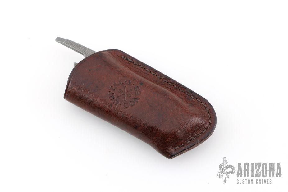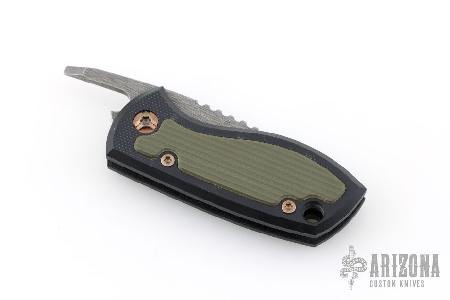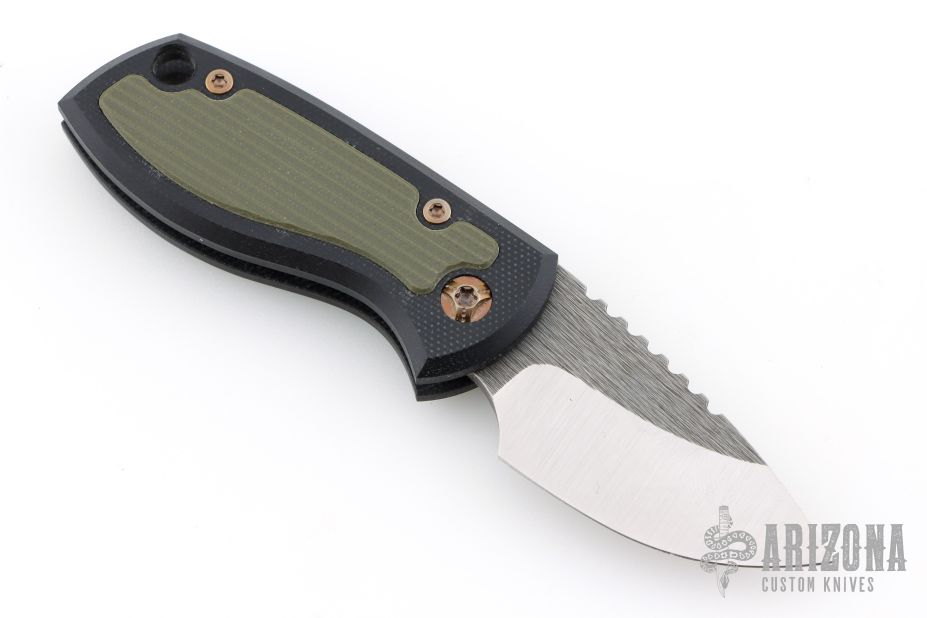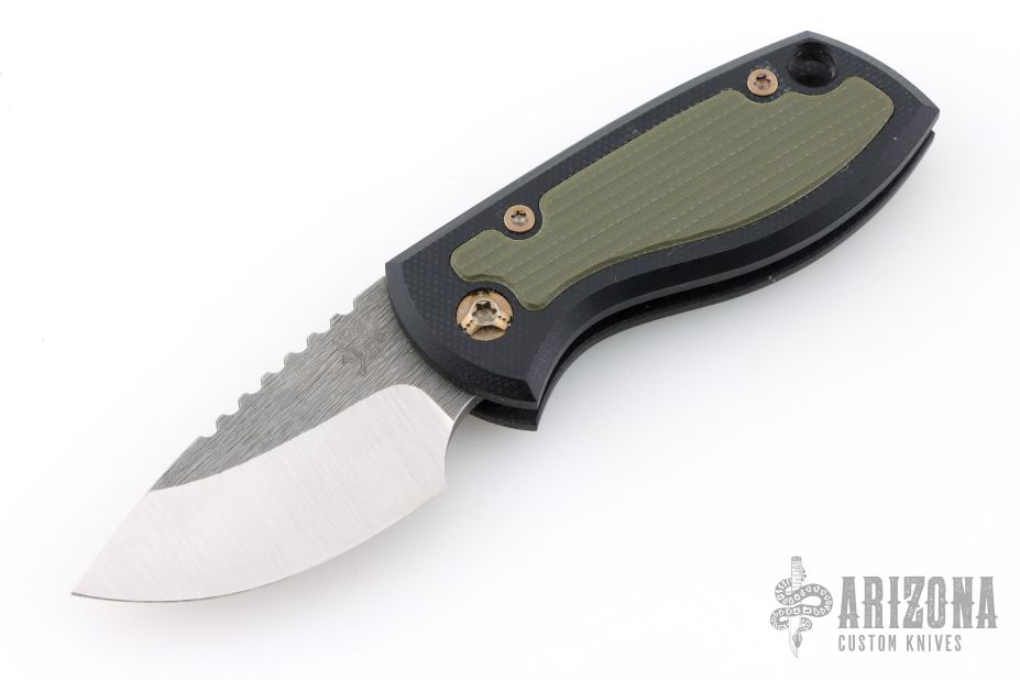 This Friction Folder by JW Knife & Tool features a two-tone finished blade with thumbrest. The handle has black G-10 scales, green G-10 inlays, titanium posts, and lanyard hole in pommel. Comes with a black leather sheath. Excelllent condition.