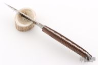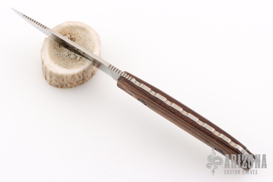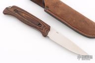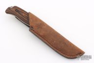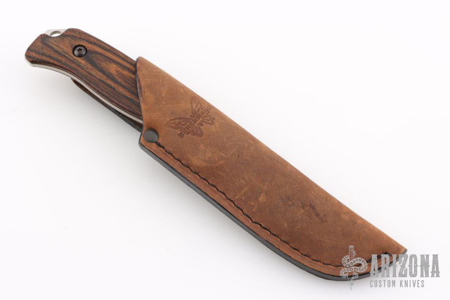 The blade is a modified clip point design crafted from CPM-S30V Stainless Steel is heat treated to 58-60 HRC. The contoured G10 or Dymondwood grips look great and provide a comfortable gripping surface. The G10 handle version comes with a form fitting Kydex sheath with reversible belt loop and the Dymondwood version comes with a rich, pressure fit leather sheath with an integrated blade guard.