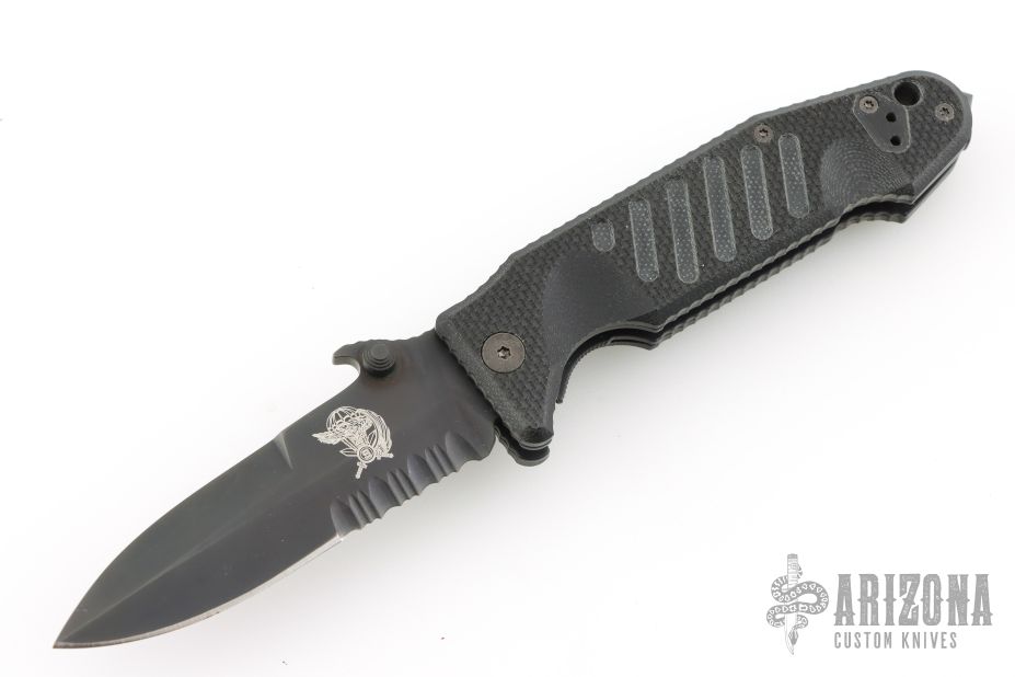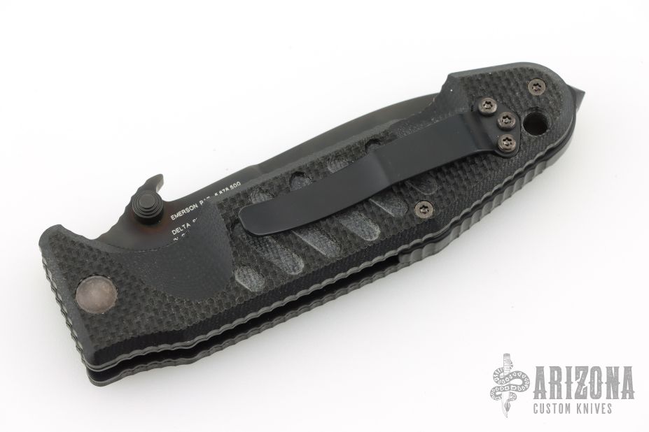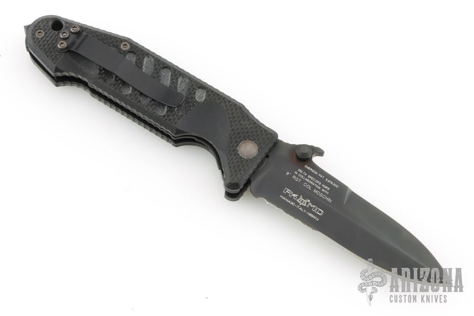 Fox Cutlery seamlessly blend together the finest available tactical knife components- precision machined G-10 handles, massive cobalt vanadium N690Co Bohler stainless steel blades and a hardened glass breaker/impact pommel with Ernest Emerson?s patented wave rapid opening device. The heart of the Delta Wave is the razor sharp partially serrated spear point blade, (Rockwell-C-59/60) treated with a black DLC coating for the utmost in wear and corrosion resistance, while the liners, screws, clip and locking face are hardened to resist wear over time. An ambidextrous pocket clip and dual thumb studs are standard equipment. Whether you are looking for the hardest use tactical folder available or a martially influenced collectible with serious cutting performance, the Delta Wave easily fits the bill. Comes with original box. Excellent condition.