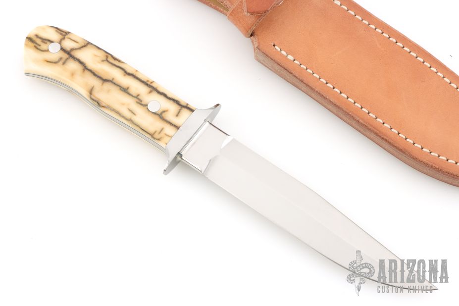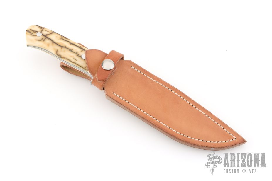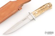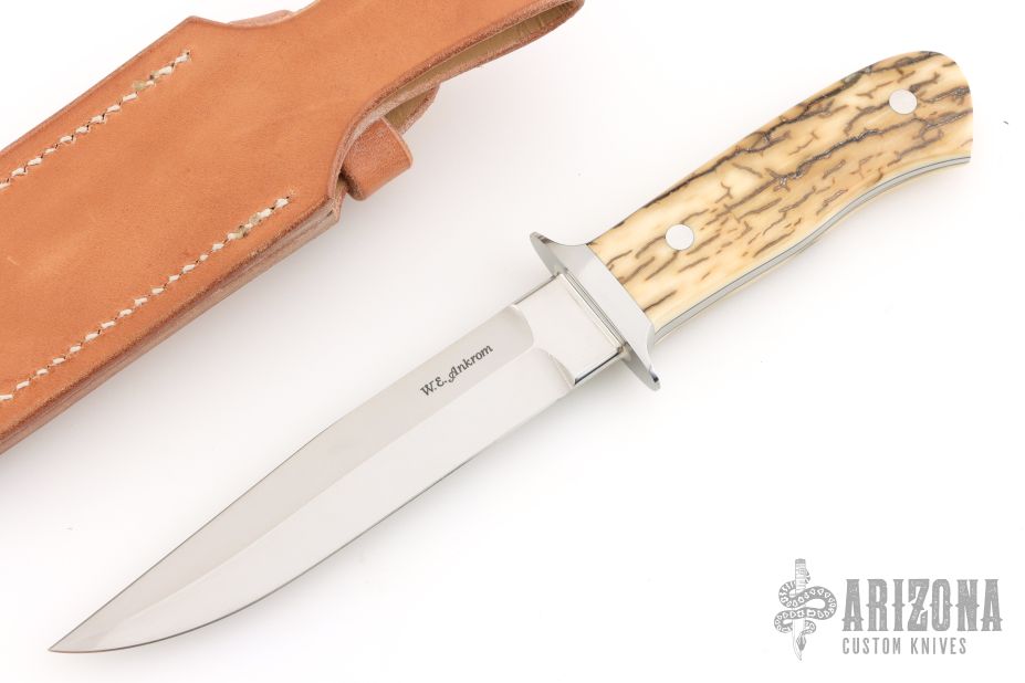 This Mini-Wilderness by Bill Ankrom features a hand rub satin finished blade with sharpened top edge, .194" blade stock and 1.003" blade depth. The handle is comprised of a stainless steel guard, mammoth ivory scales with black liners, steel pins, and full tapered tang construction. Comes with leather sheath. Excellent condition.