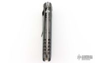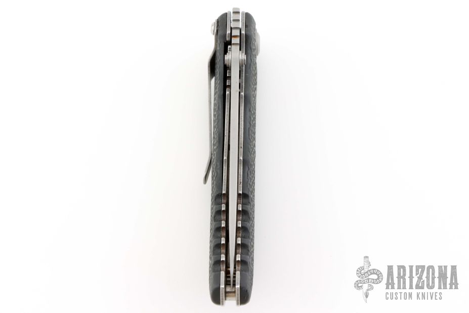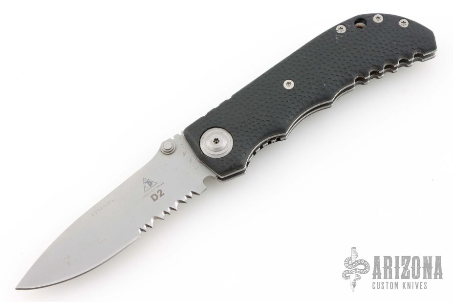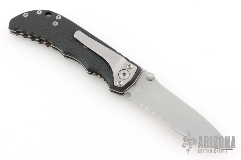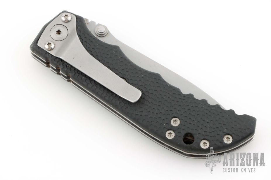 This D2 Harsey Linerlock D/A has a bead blasted partially serrated blade, dual thumb studs and notched thumbrest. Handle is non-slip polymer over stainless steel liners, lanyard hole, and bead blasted stainless steel tip down clip. Very comfortable knife in the hand. Hard to find piece. It has a hidden button under the scale. Has scuffs and scratches, good condition otherwise.