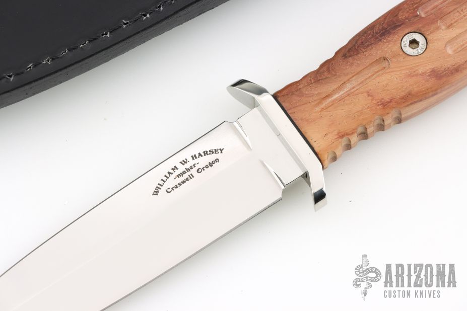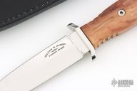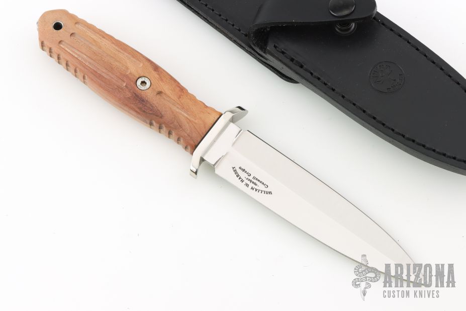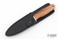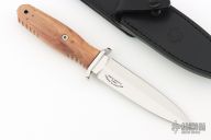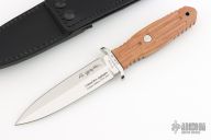 This Applegate-Fairbairn Boot Dagger by Boker Knives has a satin polish finished double edged spear point blade with .179" blade stock, 1.282" depth. The handle is comprised of a matching steel guard with black fiber spacer with Rosewood handle over hidden tang construction. Lanyard hole in pommel. Includes original box, papers, and leather sheath with belt loop. Numbered 084/199 on guard. Excellent condition.