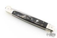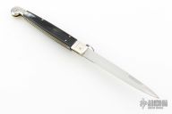 This 12" Sicilian Fighting Knife Ringpull Auto by AGA Campolin features a tumble polished spear point blade. The handle has nickel silver bolsters, buffalo horn scales, brass liners and stainless steel backspacer. Has a ring pull. Comes with leather slip sheath and COA. Excellent condition.