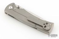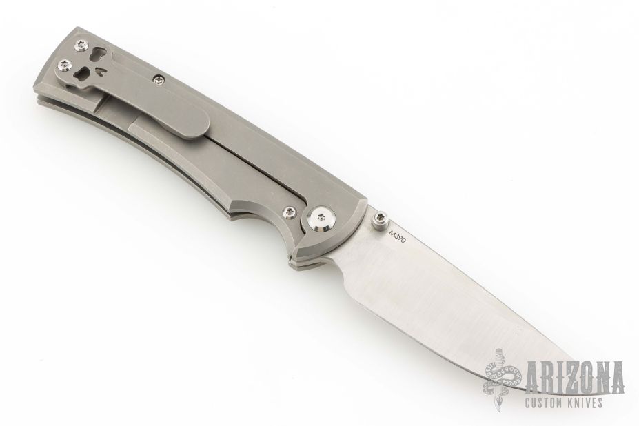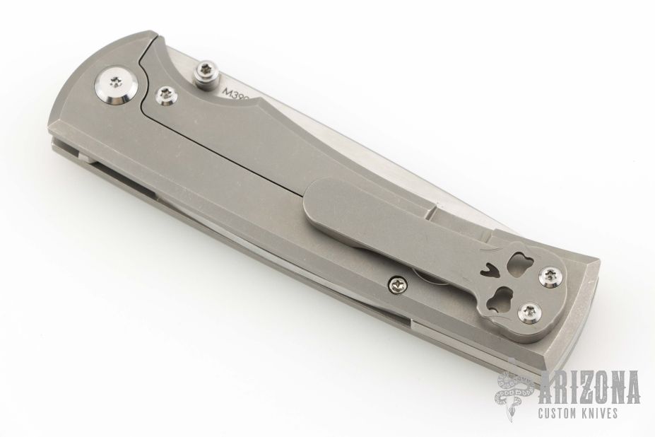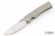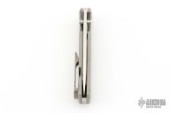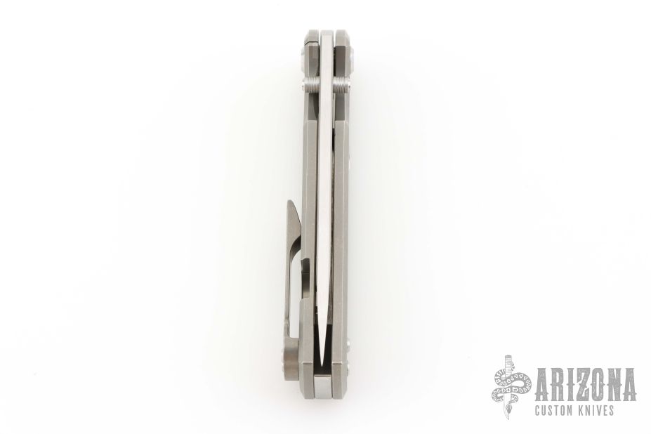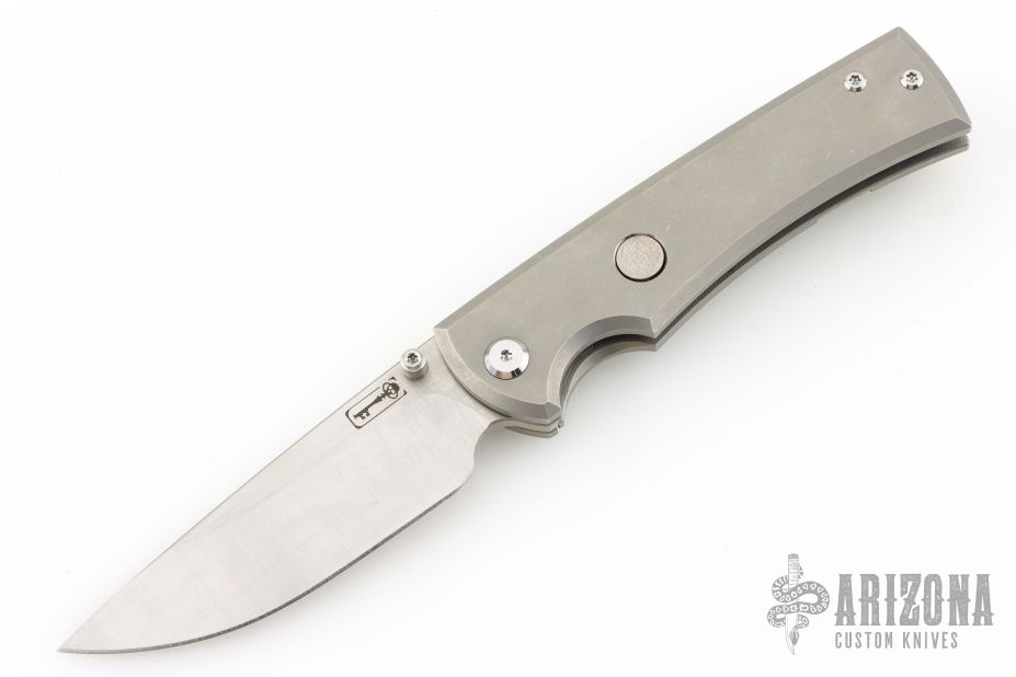 This Chaves Ultramar Liberation drop point has been professionally converted to a side-opening automatic by Kyle Vallotton. It features a satin finished blade with the Chaves logo, a tumbled titanium frame with skull pocket clip positioned for tip-up carry, and a matching titanium backspacer. Additional details include jeweled steel backspring. The knife comes with its original box and a spare titanium pocket clip, and is offered new from the maker.