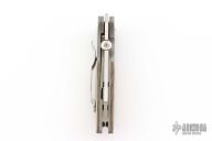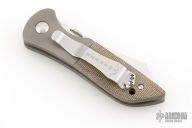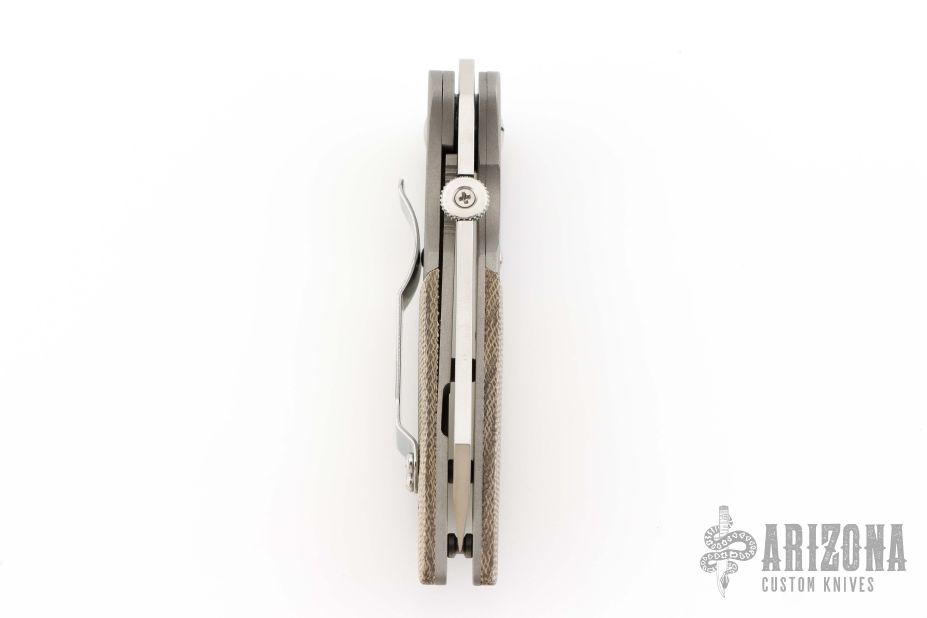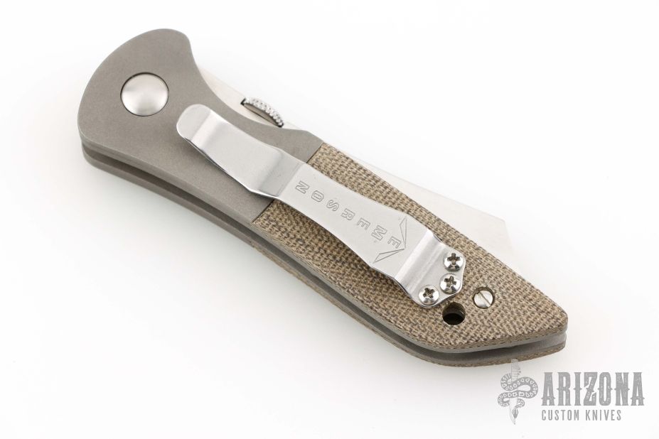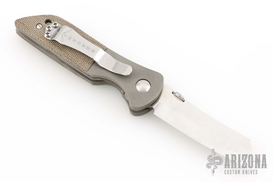 This Custom has a satin finished blade with thumbdisc. The handle has dovetailed and bead blasted titanium bolsters, green canvas micarta scales, bead blasted titanium liners, tip up stainless steel clip. Comes with original box and papers. Has a couple scuffs, otherwise excellent condition.