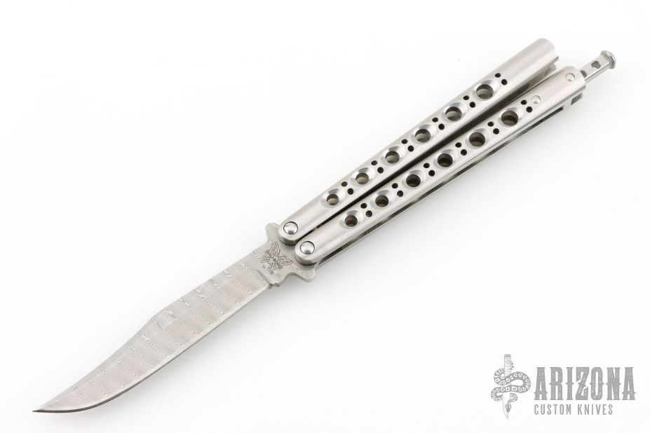 This super rare Benchmade is #005 of a limited run of just 100 knives and features a stunning Damasteel blade. It is in Excellent condition. Comes with a Benchmade box, sheath and papers. This 43 Bali-Song features a Damasteel Bowie blade with serial number on back. The handles are stainless steel with a spring latch to secure the knife open and closed.