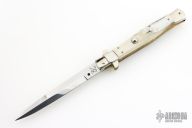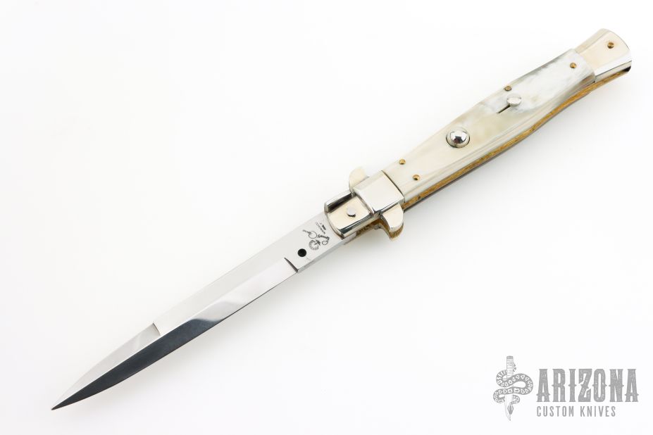 This Picklock Auto by Renzo Passcotto features a mirror finished blade with unsharpened edges. The handle has horn scales with brass liners and nickel silver bolsters. Has safety. Comes in a cloth pouch. Excellent condition.