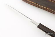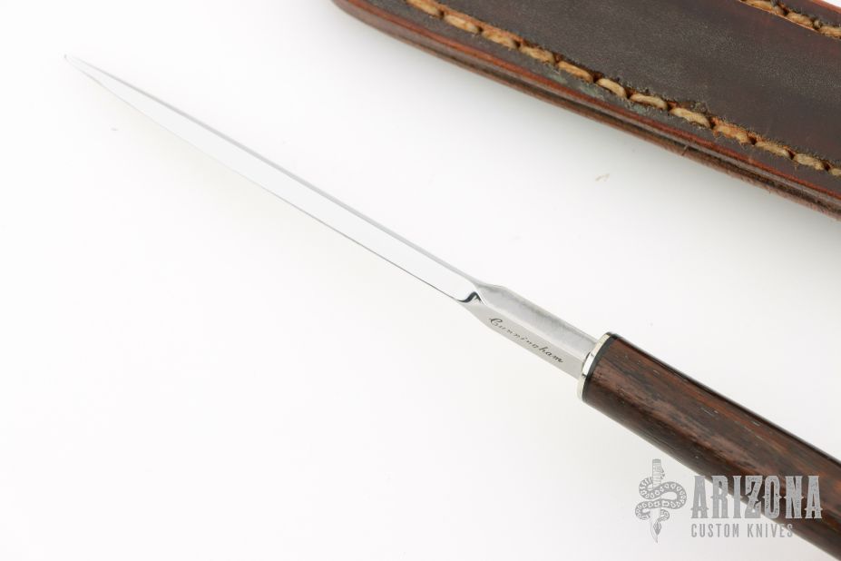 This spike was made from steel, by Jim Cunningham has a 4" steel spike with four sides, nickel silver ferrule, cap, and wood grip. .186" thick, with a .560" diameter grip. Comes with leather sheath with clip. Has a couple light scuffs, excellent condition otherwise.