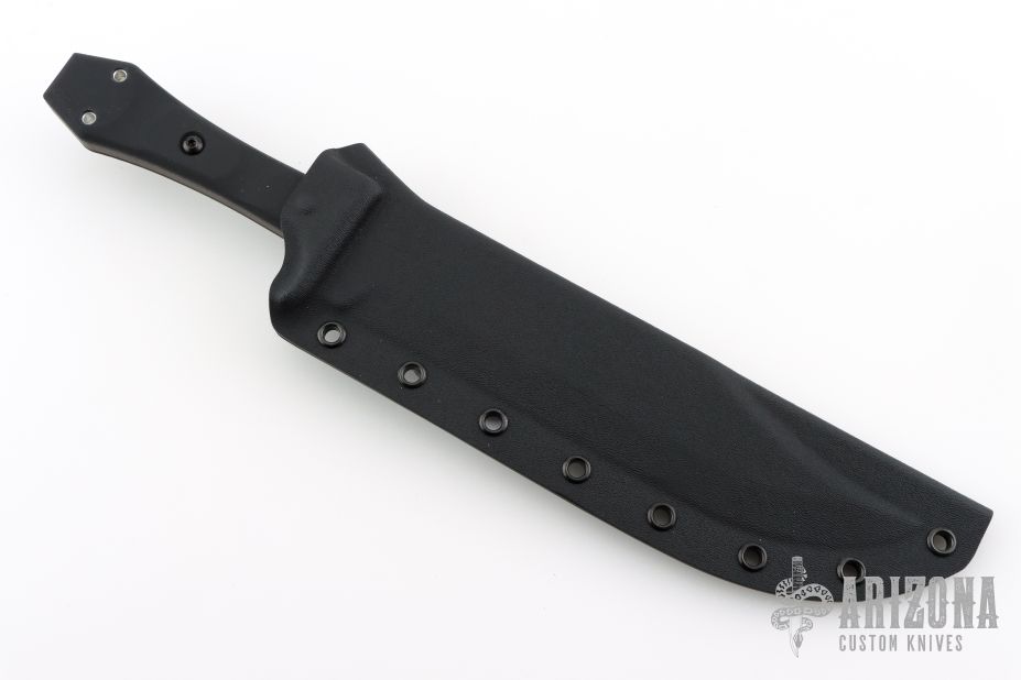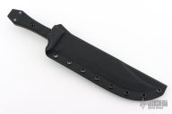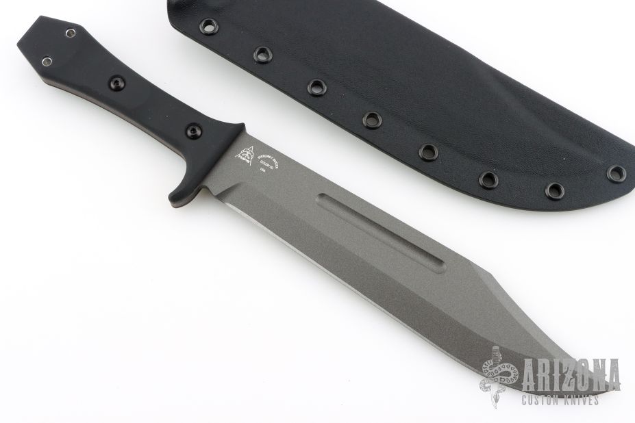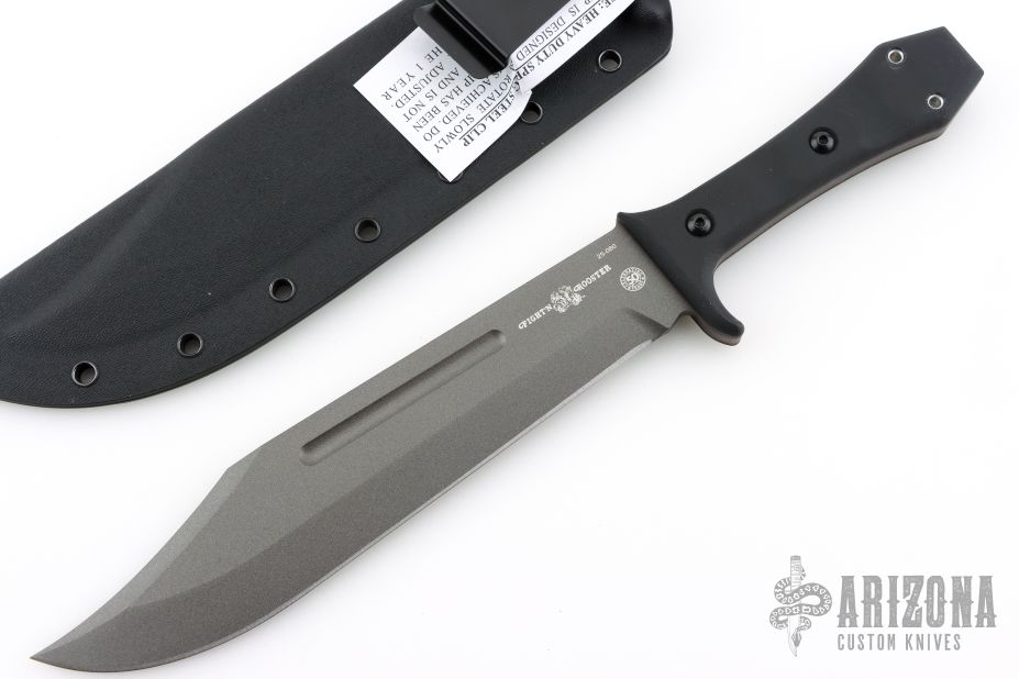 This Walkabout Bowie by Tops and Sterling F. Buster Cutlery Co. was made for Fight'n Rooster. It features a Tungsten Cerakoted blade with fullers and false top edge, .188" blade stock and 1.764" blade depth, full tang construction with black G-10 scales with red liners. Comes with a kydex sheath with belt clip, and original packaging. New from maker. #25-080