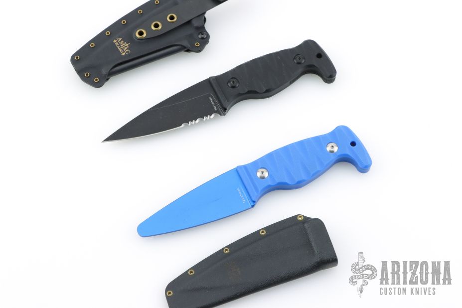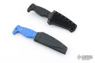 Has a black stonewashed blade with .160" blade stock and 1.208" blade depth, full tang construction with black G-10 scales. Comes with an ambidextrous kydex sheath with velcro loops on one side and a metal clip on the other. The sheath also holds a fire steel in the sheath. Comes with matching trainer. Comes with an additional kydex sheath. Comes with original box and papers. Excellent condition. #1231