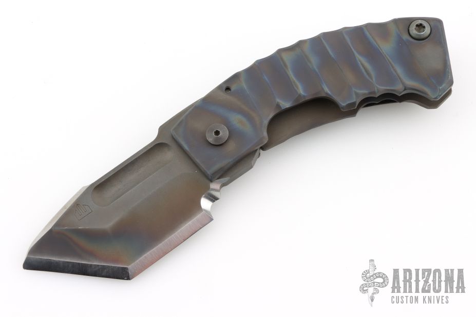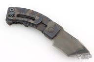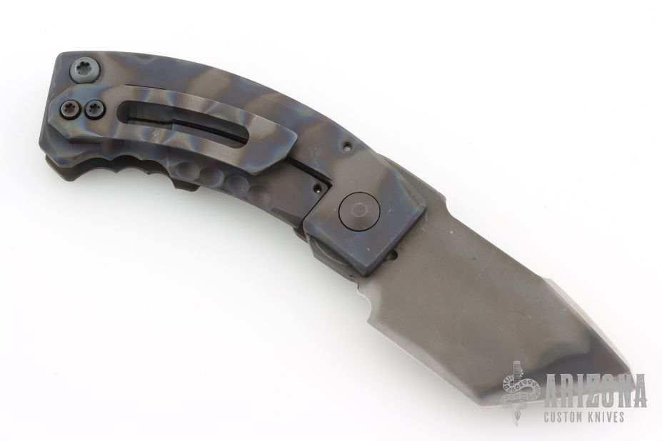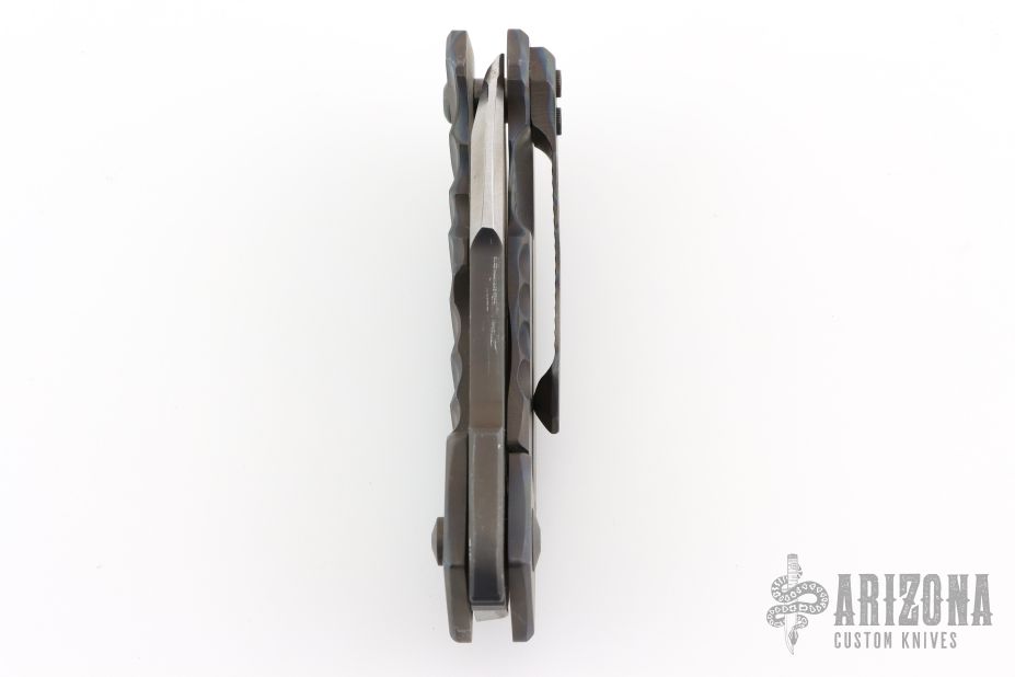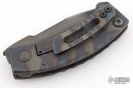 This Apex folder from Crusader Forge features a "phantom" finish blade. The handle scales are crafted from GR-38Ti titanium slabs that are then milled and hand sculpted and coated to match the blade. Tip up titanium clip with matching finish. Nice detent, lockup and blade seating. Has some scuffs and scratches, great condition otherwise.
