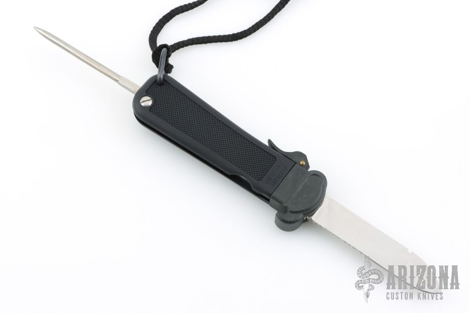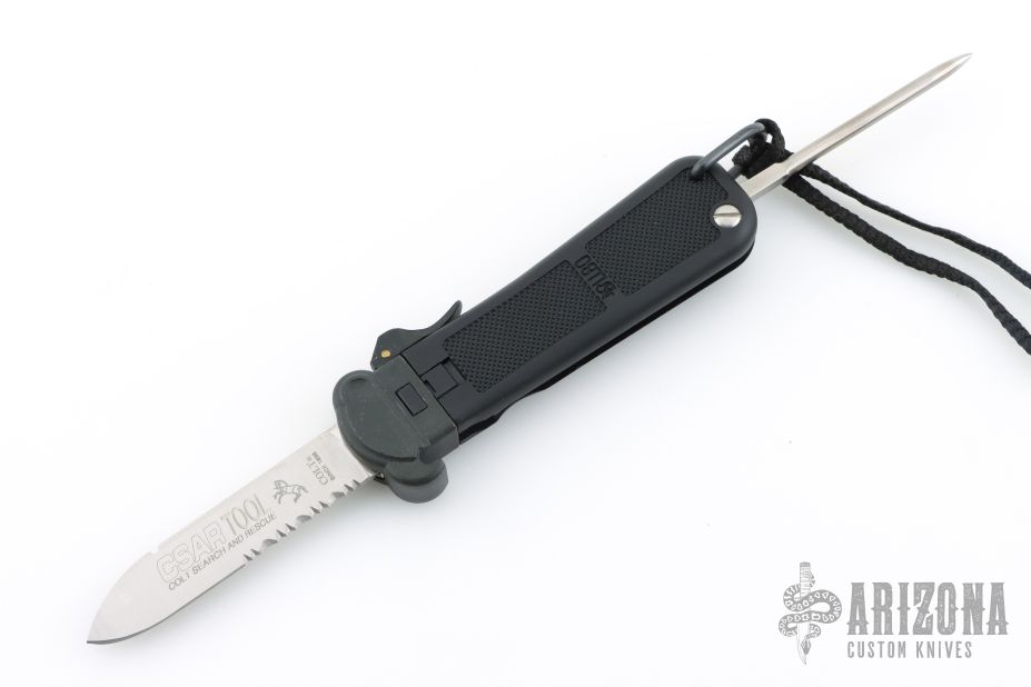 This CSAR Tool from Colt features a satin finished partially serrated blade. Blade deploys with gravity. The handle is black plastic and rubber. Comes with original box and papers. Excellent condition.