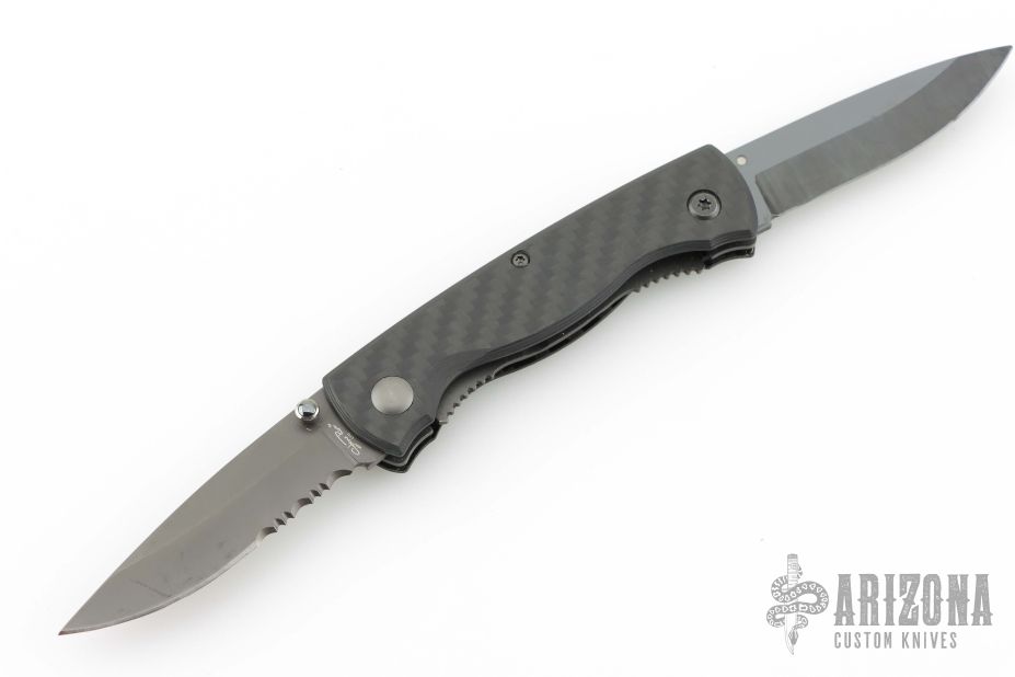 This Two-Blade Folder from Stone River Gear offers an innovative design with a ceramic and a stainless steel blade. The ceramic blade has a black finish and a plain edge, while the 440 stainless steel blade has a gray titanium coating and a partially serrated edge. Each blade has a thumb stud opener and locks in place with a stainless steel liner lock. The handle is made from strong and lightweight carbon fiber. Add a high performance folder to your collection today with the Stone River Gear Two-Blade Folder.
