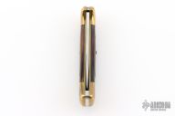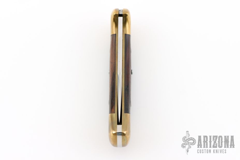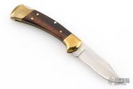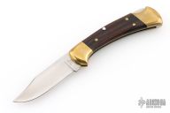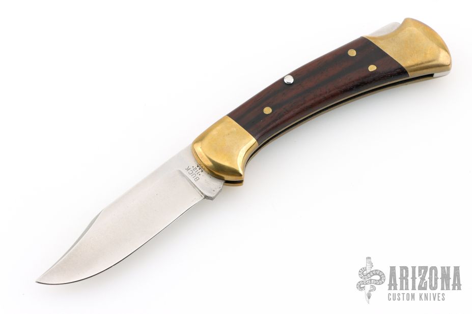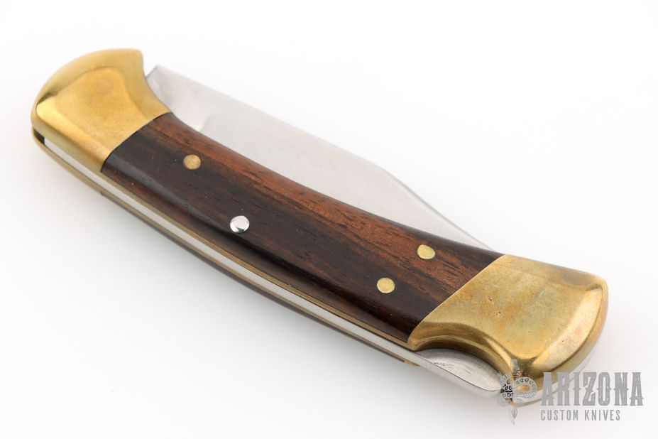 This Vintage Buck 112 features a satin finished clip point blade. The handle has a brass frame with Macassar Ebony wood scales and a stainless steel backspacer. Has some light scratches, and patina. Excellent condition for its age.