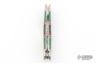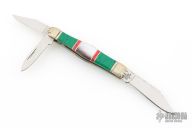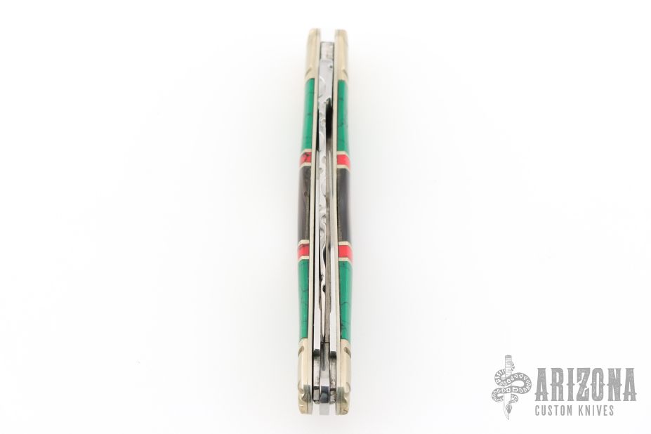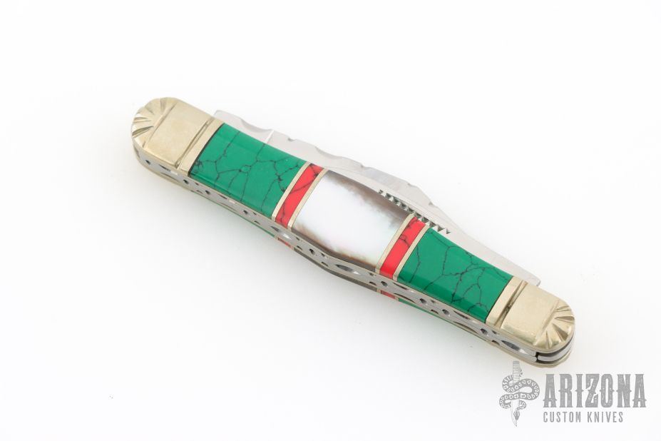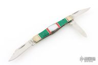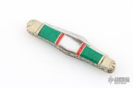 This slipjoint by Scrade Custom Series features mirror polished blades with nail nicks and fileworked spine on the main blade. The handle has fluted and scalloped nickel silver bolters, mosaic green and red stones and black lip pearl covers, nickel silver liners and fileworked stainless springs. Excellent condition. Comes with original box.